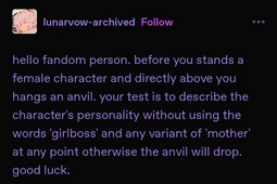 >>6287>every protagonist has to be someone onto whom they can projectInterestingly, things shifted a lot after people started caring about "muh representation". People used to make their self-inserts idealized, Mary Sue versions of themselves but now everyone just projects every single mental illness and microlabel they identify with onto not only their OCs but existing characters.