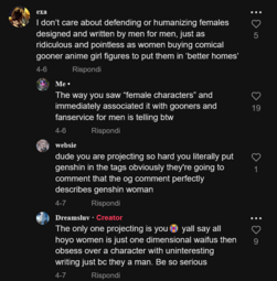 Then there's the fact that shows with two female leads with an interesting relationship are still not common. Popular ships are usually between leads no matter the genders. I might think something like 'the MC and her best friend are cute, I ship it', but that's just casual shipping, and it's not going to drive me to make fanworks. Does Genshin have any potential F/F relationships that are even slightly as interesting as any combination of Madoka characters? It goes out of its way to make the waifus as bland as possible. Just thinking that two of the girls look hot together is usually not going to be enough fuel to make content. (Usually, because plenty of BL gets made just because of this, but again, there are more women in fandom who think men are hot, so less people are going to be drawing yuri ships based on hotness, because men are more likely to do solo lewds, mob doujin, etc)