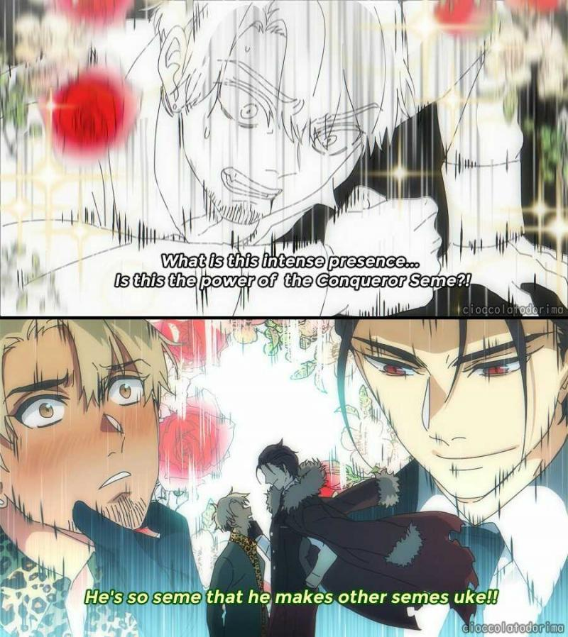 >>4674>>4683>>4682I've never understood people who will only read specific seme/uke. Having preferences sure, but good writing and art is good writing and art. Variety is the spice of life, as long as you don't make them OOC you can place them in whatever sexual scenario you want. Variety is the spice of life after all.