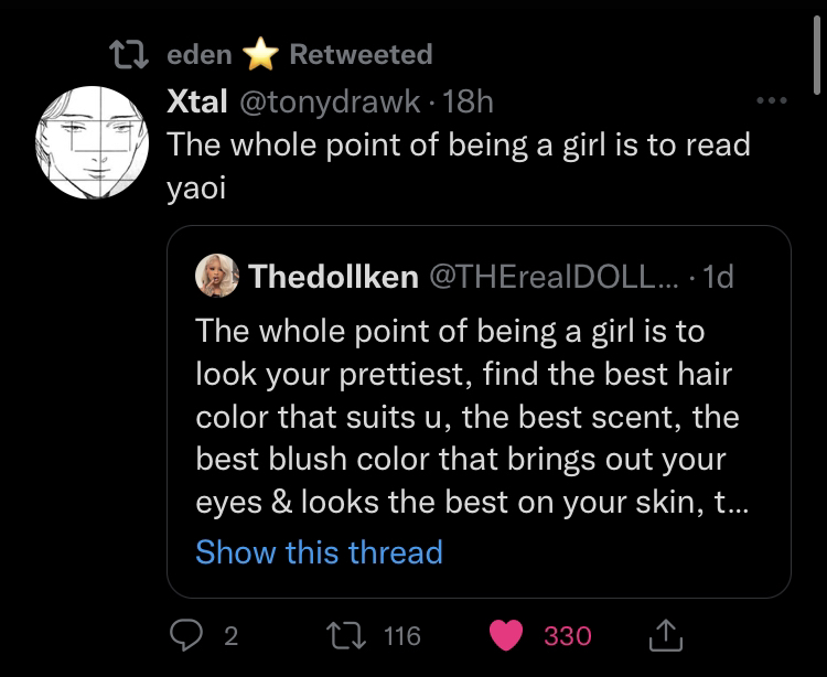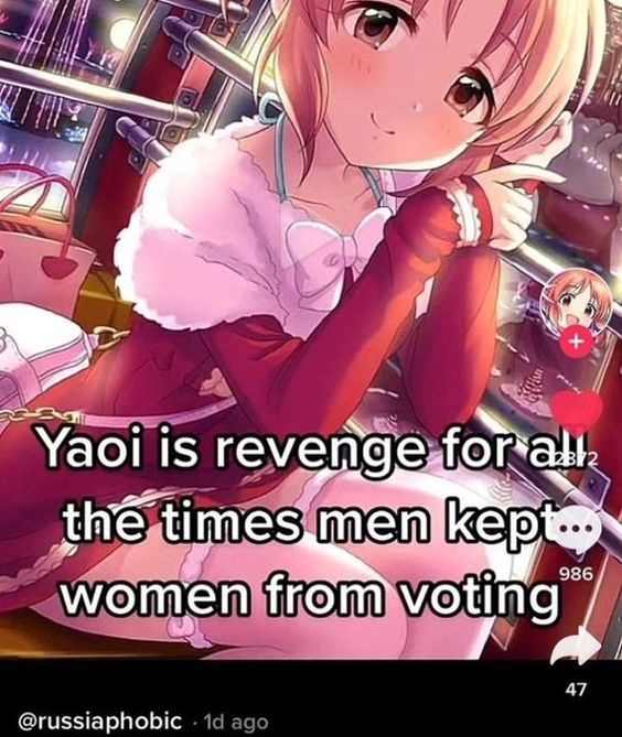 >>1611The yaoi paddle was such a sign of power too. Fujos used to legitimately terrorize moids at conventions.