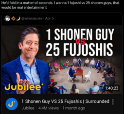 >>8195These interactions fujos have with normie sports moids are always hilarious, otakus could never have a laugh and go along with the joke like this.