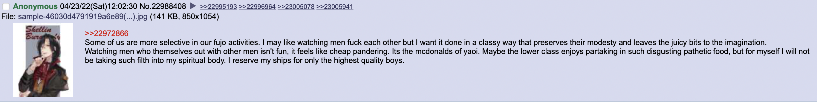 >>808/vt/. Some retarded pick-me is trying to impress incels by saying she doesn't like certain kinds of yaoi roleplay. Sis, they still don't like all fujos you're gonna get lumped in with the rest of us regardless.