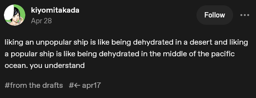 I'm in a fandom where the numbers for my pairings are in the triples.