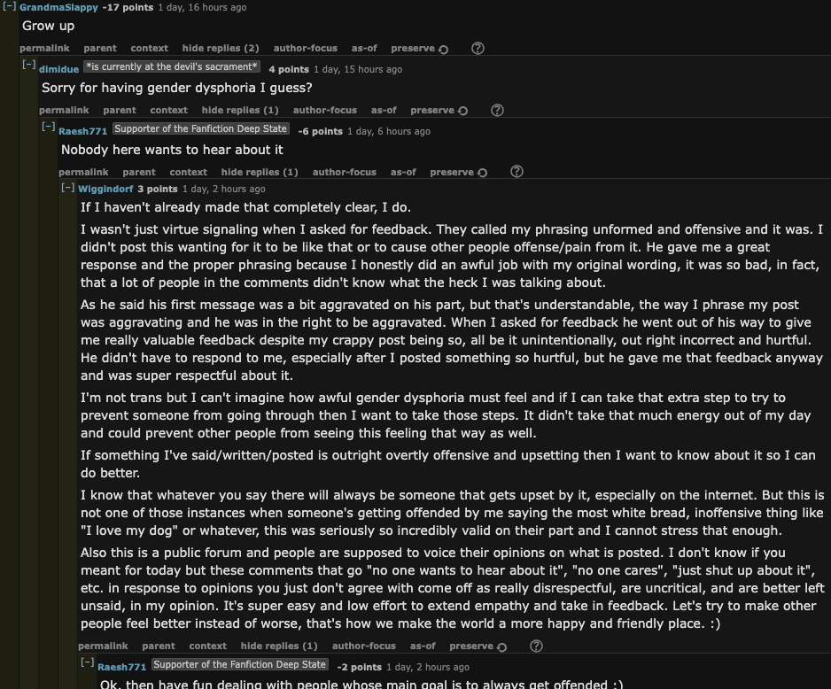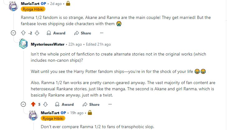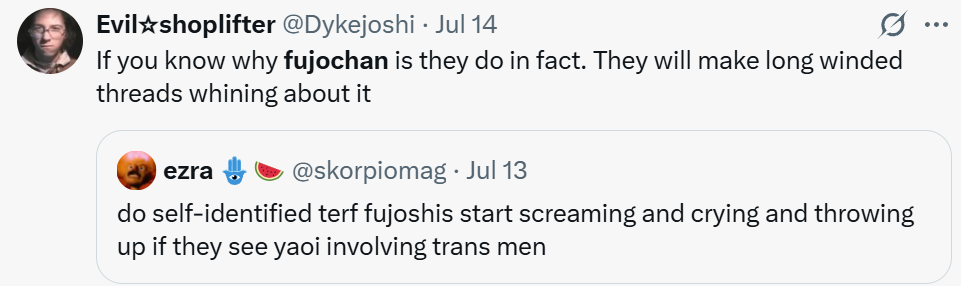 >>8867>old woman yuri and the "women" are barely 20I have this same gripe with 'old man yaoi' and one of the "old men" is barely 30 but that aside, the "fujos" who exclusively only do transbend/genderbend into yuri or trans ships I feel like they have that internalized shame of being a fujo, that being a fujo is stupid and cringe and fetishizing men while also having the tumblr activism mentality of "stop centering your life around men (and start liking women)"