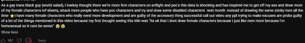 >>10840Badfic will always exist and people are free to write what they want (I love a good dead dove here and there), but the switch from writing as a passion to treating it as 'content' really killed off the appeal for many talented authors I know. I sometimes debate getting back in to fandom writing for the sake of my ships, but I think if I did I'd only post it somewhere more private like an LJ or Dreamwidth where the remaining demographic skews older.