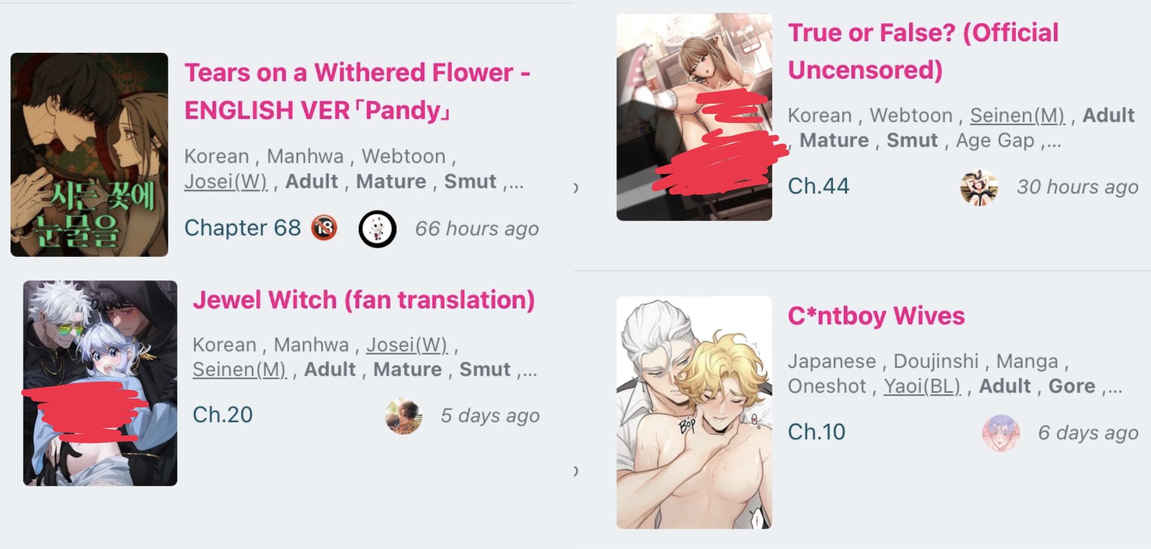 >>8715>>8716My personal issues with Jinx have more to do with the quality of the writing than any qualms about "abuse". I like the characters, but it feels like the author has no idea what to do with them. Like she wrote herself into a corner and now she doesn't know how to get out because Jaekyung abused Dan to the point that Dan lost all interest in him and now it's too late for him to redeem himself and the story is now more about Dan's family trauma while Jaekyung is trying to shoehorn himself back into his life just for sex. It's stupid, if I wanted to watch a dumb roidpig pine for someone he treated badly I'd just watch normie reality TV. But it feels like most people read Jinx for the sex scenes and because they think Dan is cute or Jaekyung is hot but don't really give a shit about them as a couple.