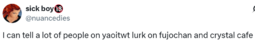 We aren't reading a general lgbt genre. Yaoi is by and for women, it's our own thing. Fujoshi have no obligation to make or read or respect yuri or have any sort of yuri alliance kek.