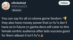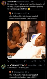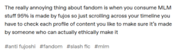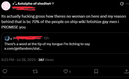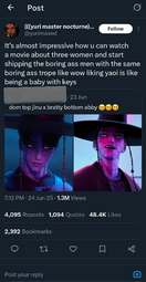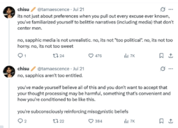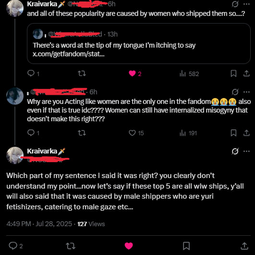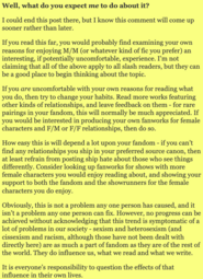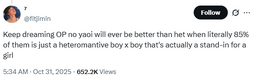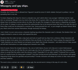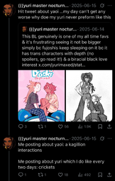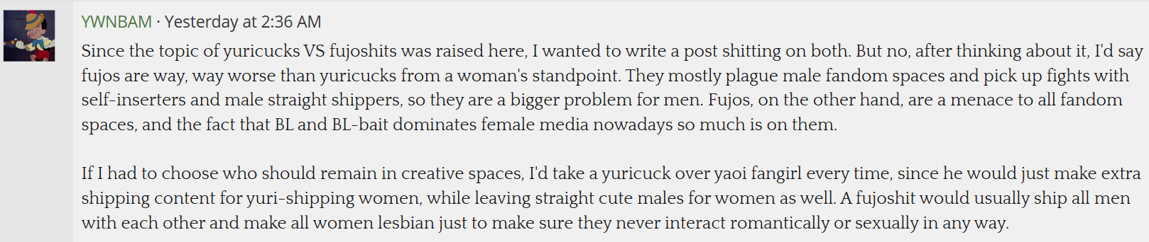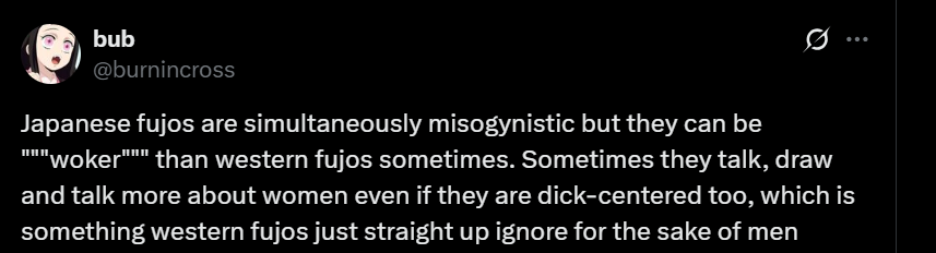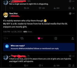 >I'd say fujos are way, way worse than yuricucks from a woman's standpoint […] Fujos, on the other hand, are a menace to all fandom spaces.In her post she doesn't explain why fujos are worse but makes sure to say yurifags are just annoying for men. I love that she hates fujos so much she can't even say why. Also I got no clue what she's saying on the second pic.