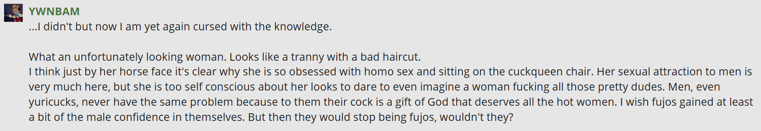 >>10979This makes me feel bad for real decent lesbians who ended up being scapegoats for manhaters and misogynistic fujophobics.