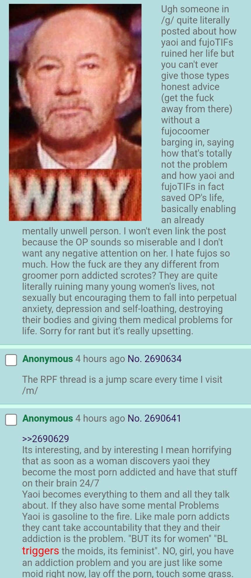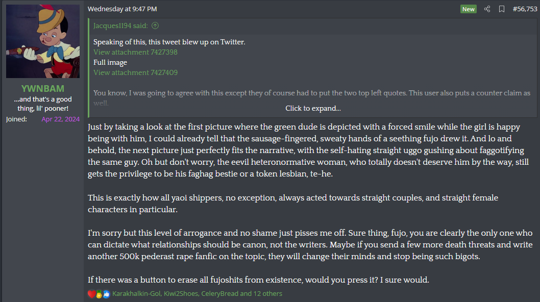 >>11012Isn't lolcow super anti fujo? Even the boards for anime tend to hate fujos because it's yumes dominating the conversation and saying the same old bullshit about fujos being misogynists because they can't self insert onto a female character. Just proves how yumes are always the biggest proponents of anti fujo talking points just like everyone else online.