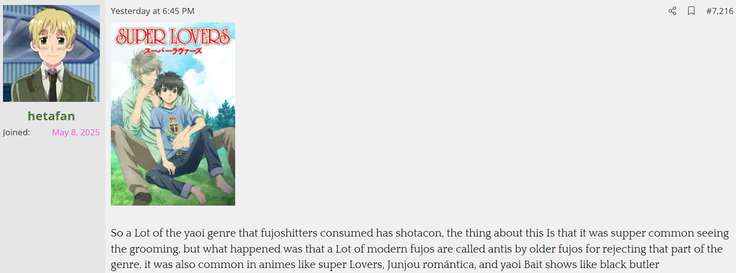 himes have read maybe 1 SoL yuri or watched Madoka, and they just pretend to like yuri for the sake of being performative and superior to yucky fujos. Not to mention the ones with the giga retarded take of 'Actually het ships are better and more ~progressive~ than yaoi because at least there's a woman!' that only ever post about het and probably can't name more than 3 yuri series (if even that). I guess that there is some truth in them only caring when a ship has a woman though, and it's not for any feminist reasons, but because they need a self insert to enjoy any romance (and they think fujos are the same, which is why accusations like 'You're self inserting as the uke!' happen).