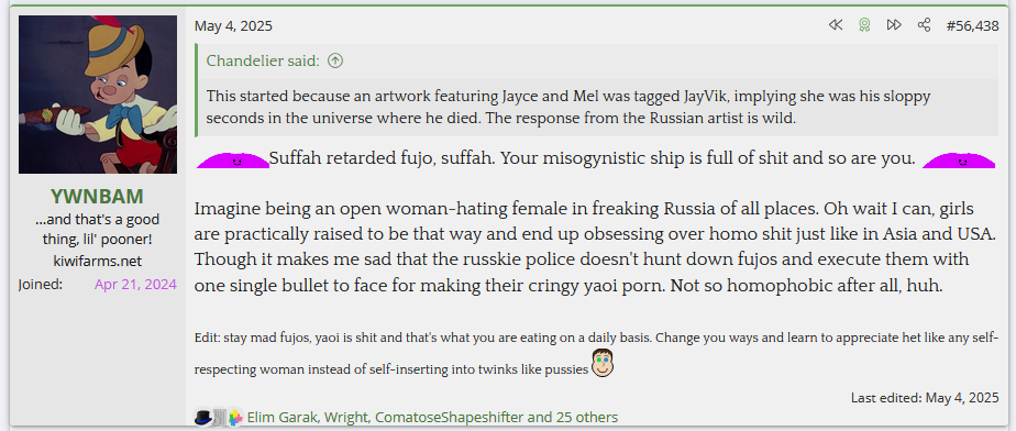 >>9031IME it's just bitterness towards other women in general. You have to have some amount of pickme-ism and NLOGism in you to be able to post on Kiwifarms to begin with but being absolutely obsessed like she is is some deep seated personal resentment. Maybe her friends in high school were fujos and shipped her husbando with another male character, that seems to be the anti-fujo origin story for most female autists.