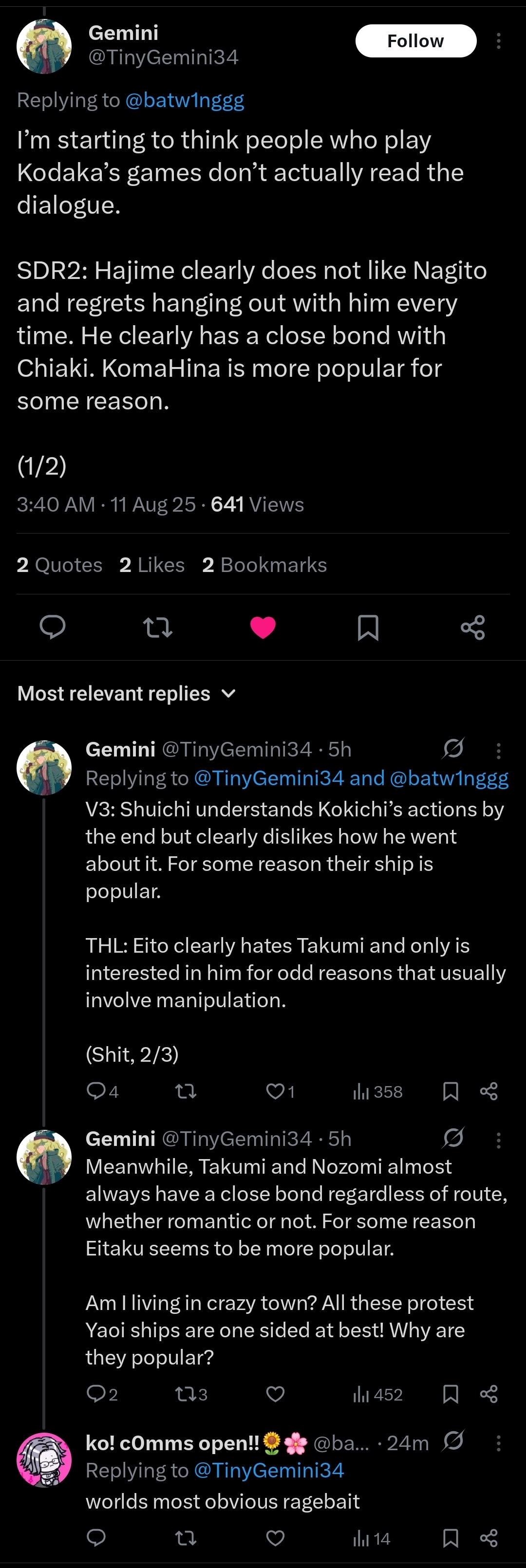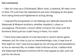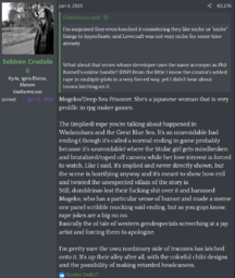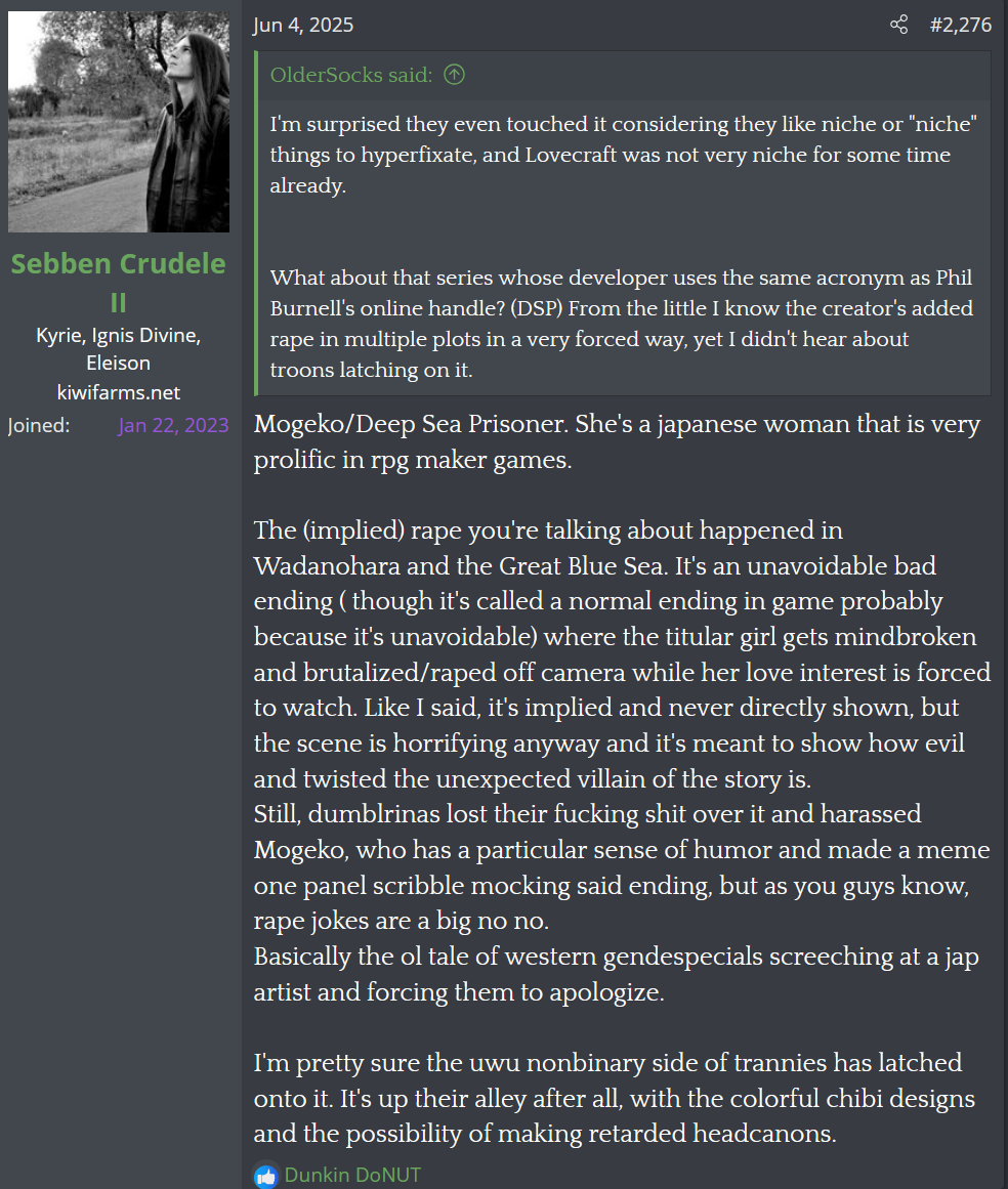 It tells me a lot that she somehow talks about funamusea as if she were only a fujo when most of her games have hardcore het rape and people love shipping loli/man who abuses her in her games yet she doesn't complain about that, ONLY the gay shit.