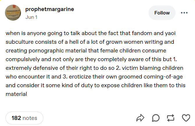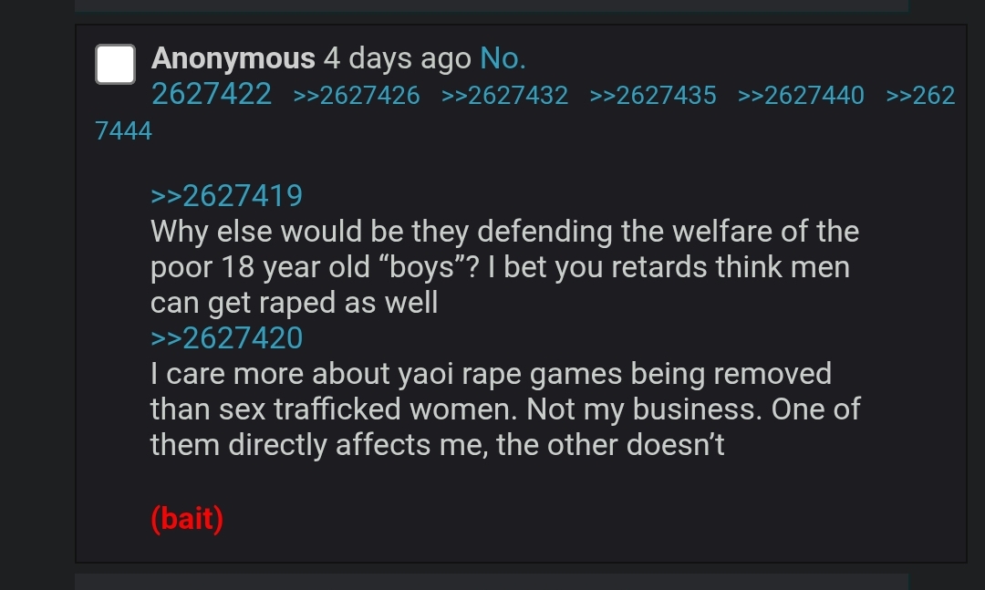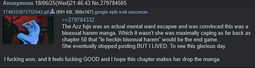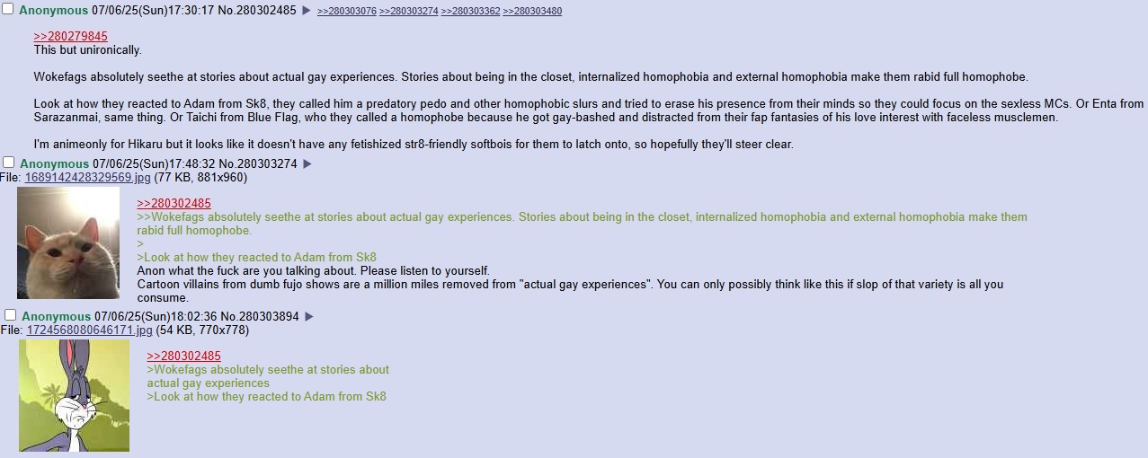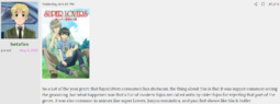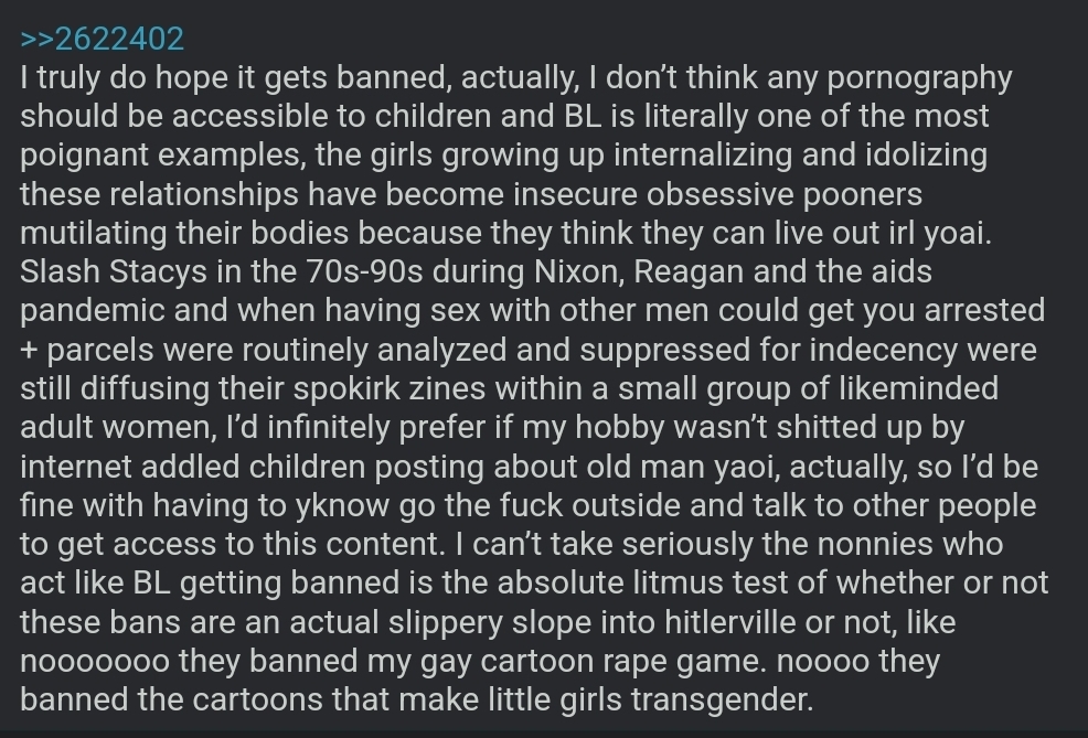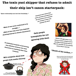 >>11014The funniest type of anti-fujo lolcow chimpouts is the ones where they write paragraphs about how reading yaoi is bad and ruining the world and reading yuri is freeing us from the shackles of the patriarchy lol, completely disconnect from reality, it's hard to think it's bait when truly it's just performative feminism central in there nowadays for twitter rejects, they are being genuine