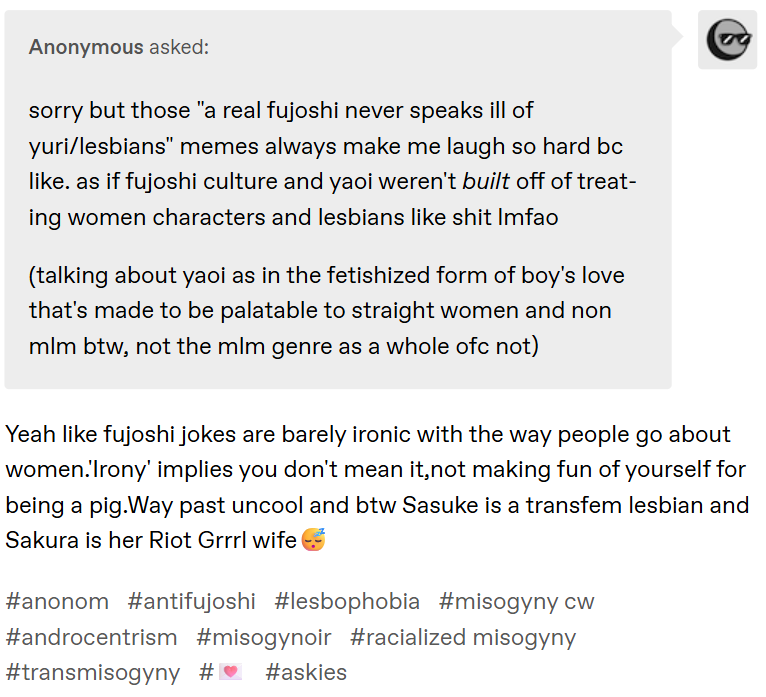 the general conclusion when I reveal that Im a fujoyumehime is that im a porn addict but I dont care. I dont make my hobby a reflection of my moral opinions or use it as a form of activism, a good story is a good story.