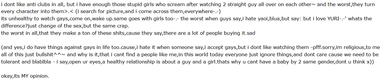 >>9032Def this. She's just a EW FUJOS EVERYWHERE IN MY FANDOM type. It always boils down to whining that fujoshi make their own content instead of het or f/f. Always.