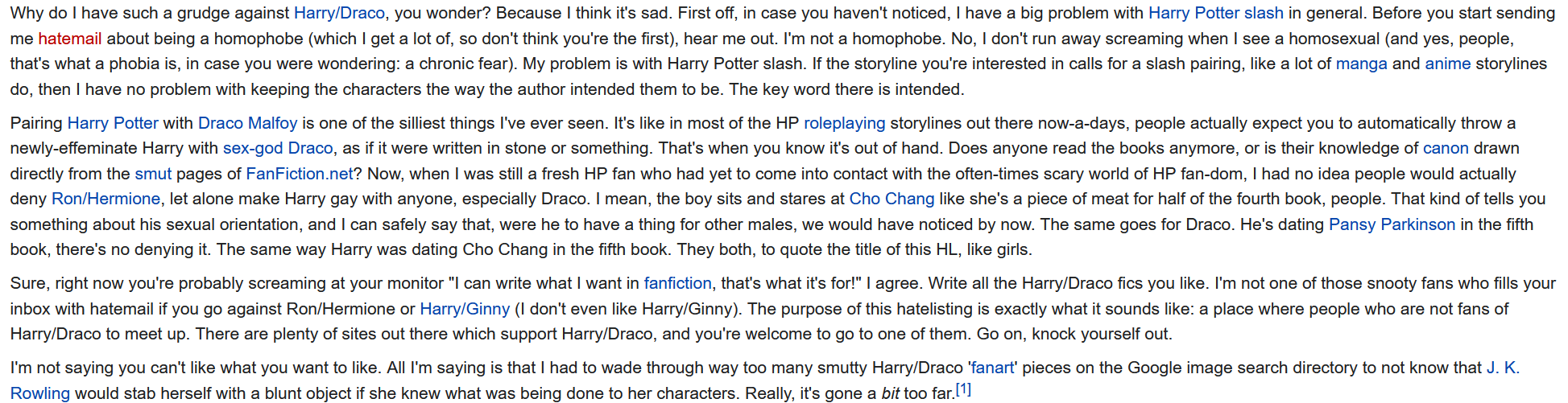 >>10723I think Ron bashing was so prevalent because it was a very rare instance of the the self-insert girl (Hermione) getting cockblocked by her own canon love interest when people were overwhelmingly shipping her with Harry or Draco.