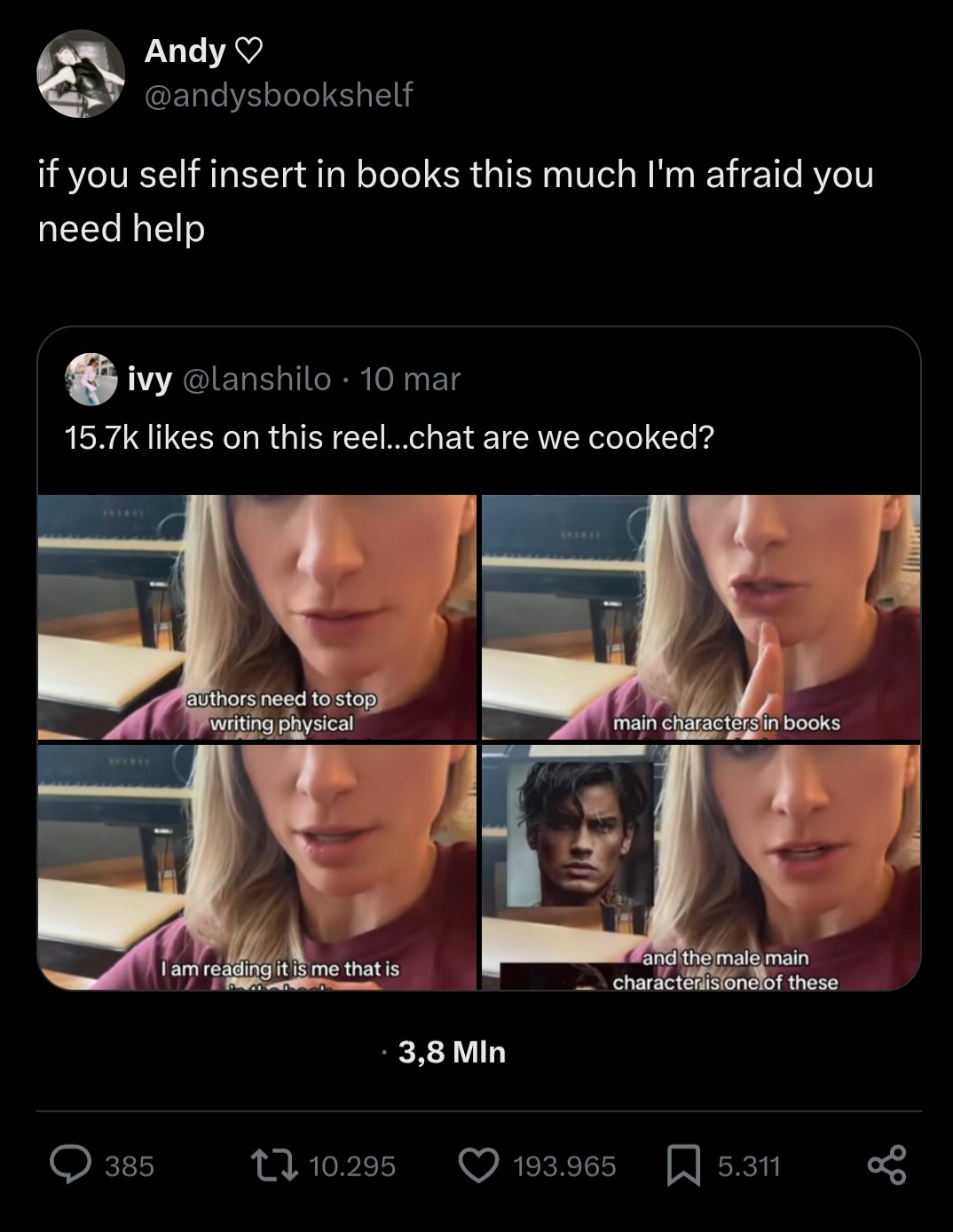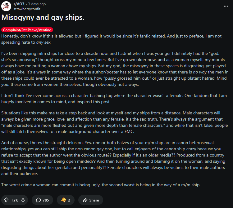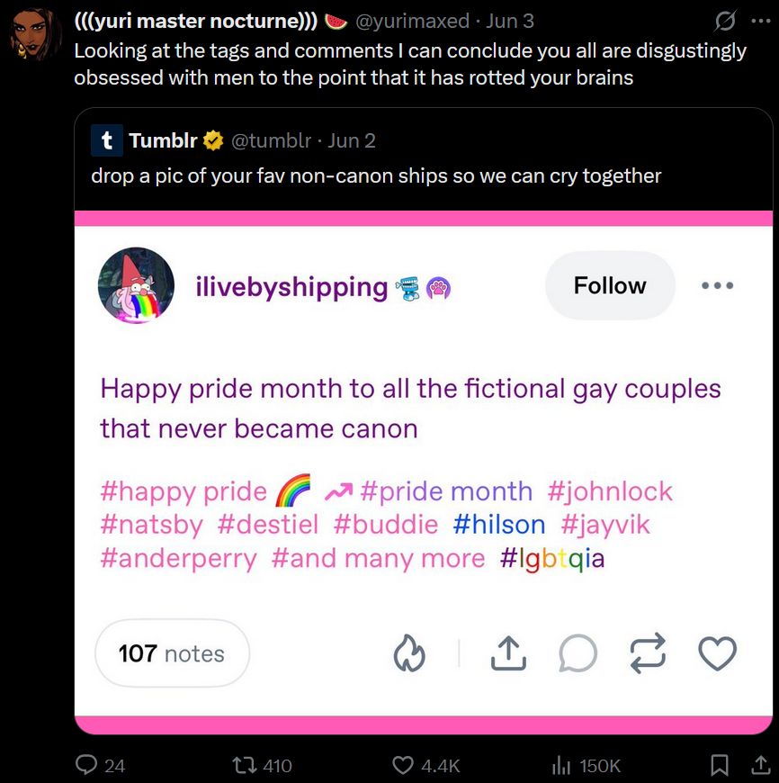 It’s easier to avoid that realisation altogether and only interact with yumes who ship themselves with other fictional men.