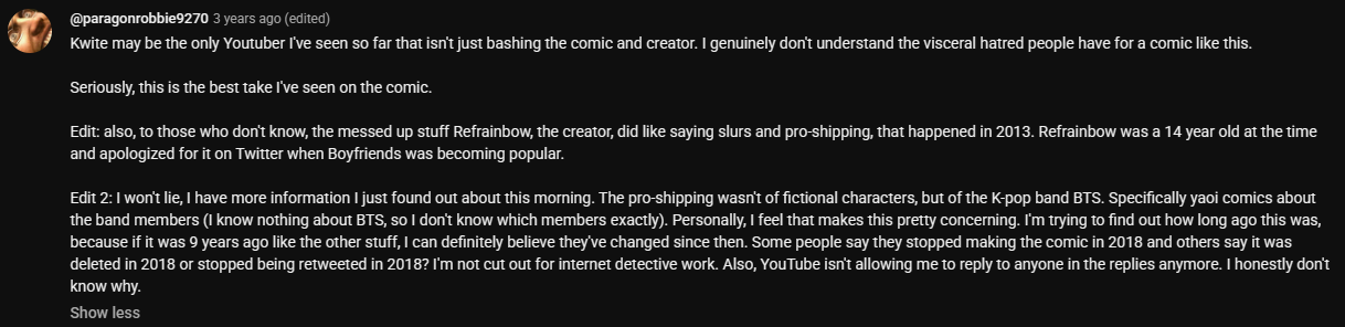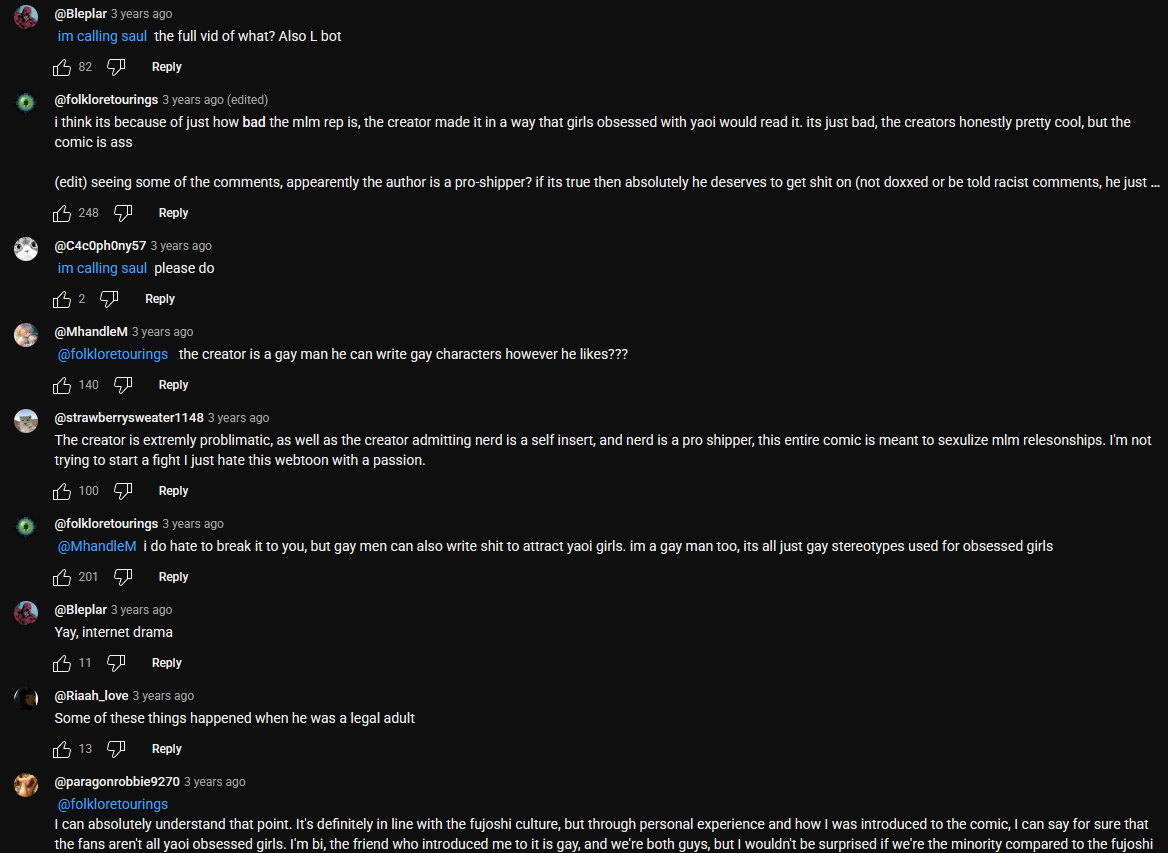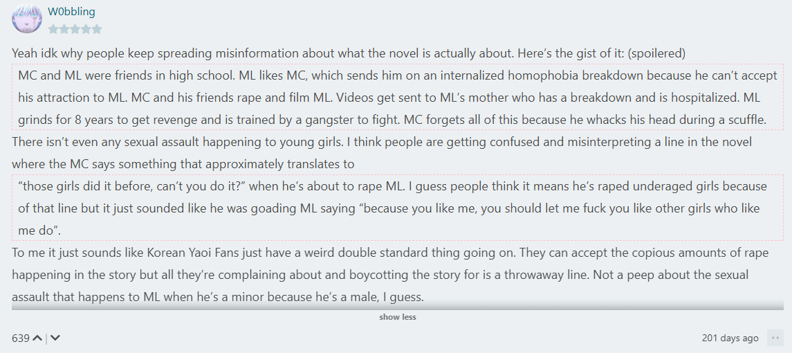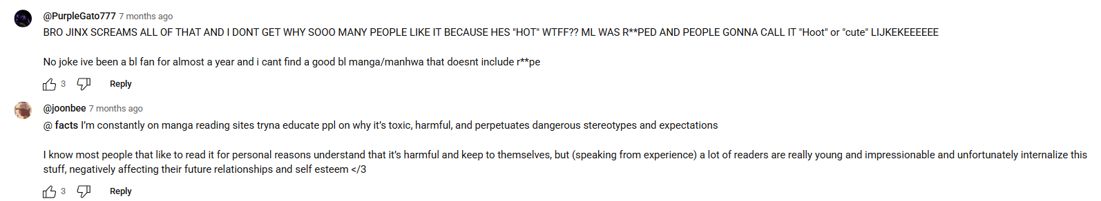 >>10690The hate train for this person proves how illogical anti fujoshi discourse is. They hate it for "cringe" but they know that's not a good enough reason to justify stalking and harassing someone, so they say they're a pedo for drawing a BTS guy while she was also underage. They can't just ignore a webtoon they don't like. They'll post fujoshi hate over webtoons with abusive semes and for having noncon, but then a fluffy slice of life webtoon also gets the same hate parade. You can't fucking win with these people.
