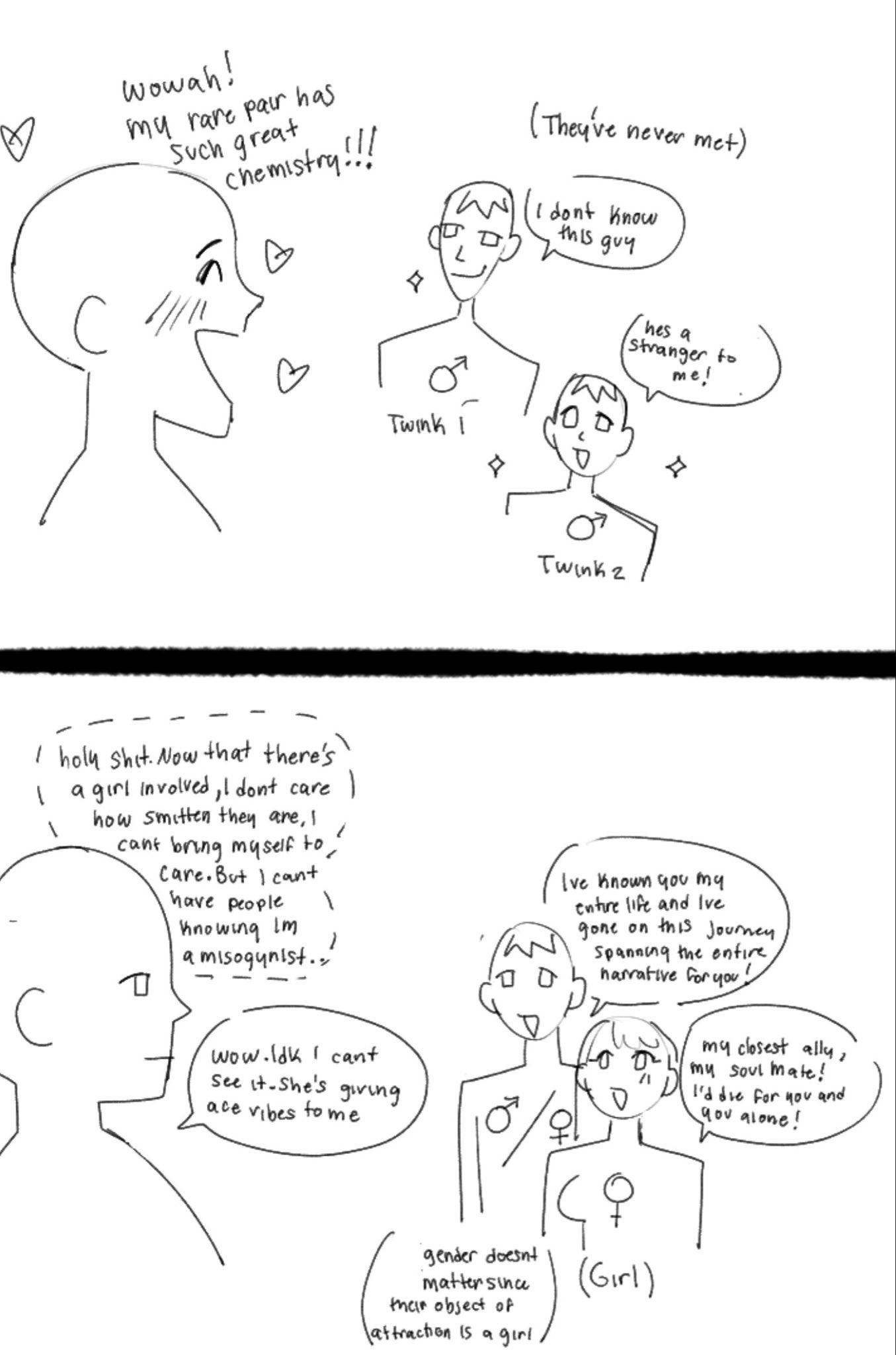 >>11070>>11072>Panel 1 is a sandbox for the fan to exploreA ton of my rarepair otps are like this. Characters that never met might have great meshing personalities, backstories, etc. Its shipping and fanfiction; who cares about lore.