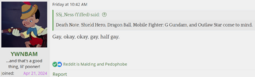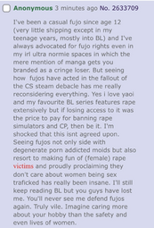 Will i get banned for bringing up lolcow in here? I don't know if the old rule still applies, but did anyone also see the big fight that lasted days, people who are pro shota and against it screaming at each other, and fujochan kept being mentioned and blamed for everything for some reason