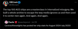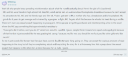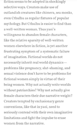 It also doesn't help that the only female characters that they bother defending are the most hyper bland, “good girls” with a token quirk or temper issue they project onto (“omg she’s totally me”), while every other girl is allowed to be actually messy, or morally gray.