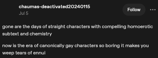 >I don't blame fujos, I just think we should redirect our money to media that actually respects usI completely agree with this, actually. But I've gotten baited many times in the past, and it's sad to see history repeat itself over and over again. That's why it's deeply frustrating to see fujos side with the homophobes referring to us as 'delusional', when it's clear that many shows, games etc like to use fujo ships for marketing and merch, only to end up giving one (or both) of the guys a female love interest by the end.