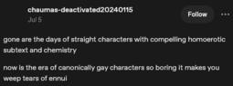When I have an actual dedication to a ship, I'd want to talk with actual shippers of that ship, not consoomers. Because consoomers never have anything meaningful to say, and they're always the one who jump to one franchise to the next anyway once the (current ships) are no longer interesting.
