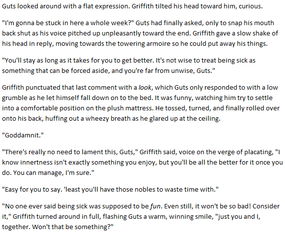 >>405Oh! I actually ended up finishing it. It was a Berserk fic, I wanted to do a little something with Griffith feeling a tiny bit remorseful after finally having Falconia. Just super light pining for Guts/guilt for the Eclipse + Slan coming around to prey on those feelings and push his buttons and make him angry at himself for still feeling anything at all.