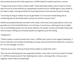 >>254I've been working on a Griffguts fic for almost two months now. Not because it's especially ambitious or anything, it's just a smutfic, but it's been taking me forever to even get to the smut, let alone finish it. I've been somewhat discontent with my writing to the point I scrapped like 2.6k words of my initial attempt on it. I don't dislike what I have this time as much as I disliked the previous iteration, but I'm still fairly slow and inconsistent with working on it. I just want to finish it so I can finally get to proofreading and see if I can make myself actually come to like it through editing. Hate that it's taking me so long.