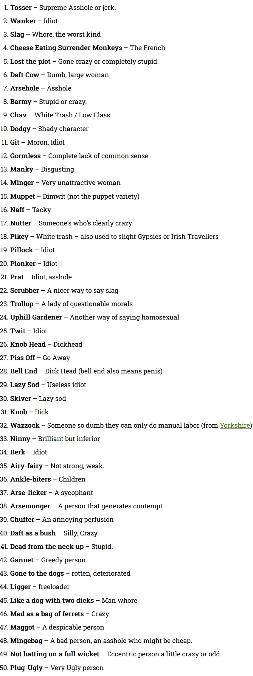 >The pairing I'm writing for bicker with each other a lot but I can't come up with clever insults to use like they do in canon so the dialogue is very dull and repetitiveExpose yourself to British comedy.