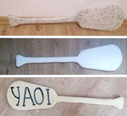 i'll try to see if I can make one too!! I also thought of maybe just buying a wooden paddle and writing yaoi on it, but I'm afraid they don't exactly have the iconic shape. Is your paddle fragile?