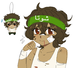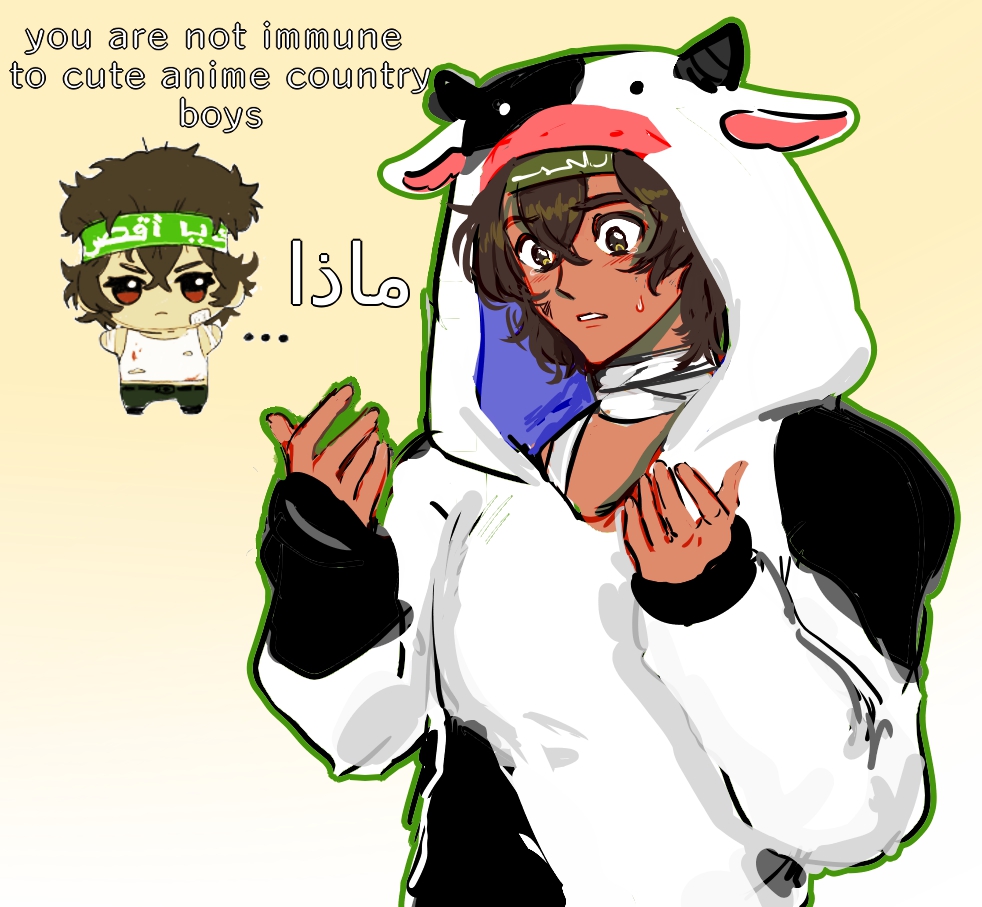 hamas-kun looks at least a decade younger, early to mid 20s, but really he's way older than israel-san who's amazingly already greying. he doesn't have much fat on his body but he has some very nice muscles and a masculine frame, very handsome with sweet brown eyes. he's all bark and no bite. his personality is melancholic, jaded, and a little paranoid these days because of the war. he is almost always on the receiving end.