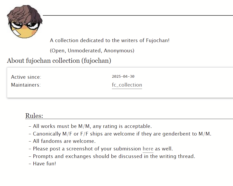And on the ao3 collection, the icon should be sangwoo like the FC's website icon. Also I feel like it should have some moderation. Like if some rando adds their stuff to the collection that clearly isn't from fujochan, I'm not sure if the creator has to remove it or not and they might not be awake to see it. I think the creator can add moderators, but I'm unsure if that's specifically for moderated ones or not. Anyway, the nonnie doing the collection itself says we'll be waiting until the 28th of April for the ao3 account invite. Which means we could start preparing a theme for May and some prompts. Oh and we could totally have a month dedicated to gift exchange/fanfic requests (although it might be difficult if there's too many fandoms involved). Also general reminder to always keep a backup of your work. Ao3 could be pissy about this despite the S.C.A.R. discord basically doing the same thing as this (doubtful but it could happen). And I do think there should be a site tag so people can filter our fics. I don't think you can filter out collection fics so the tag would be for people that don't wanna see our stuff. The tag could be like "FC Collection" or "/fujowg/ Collection"
