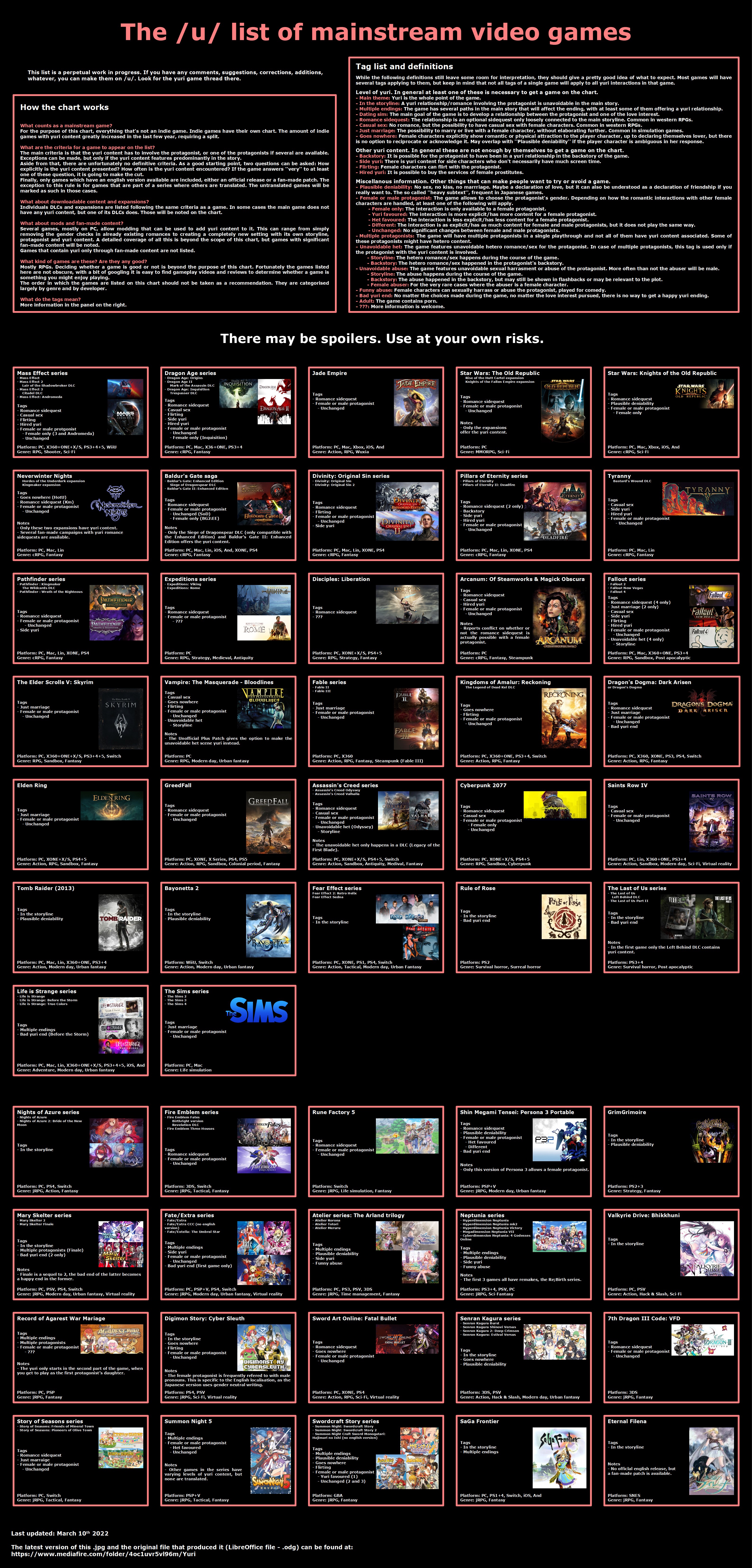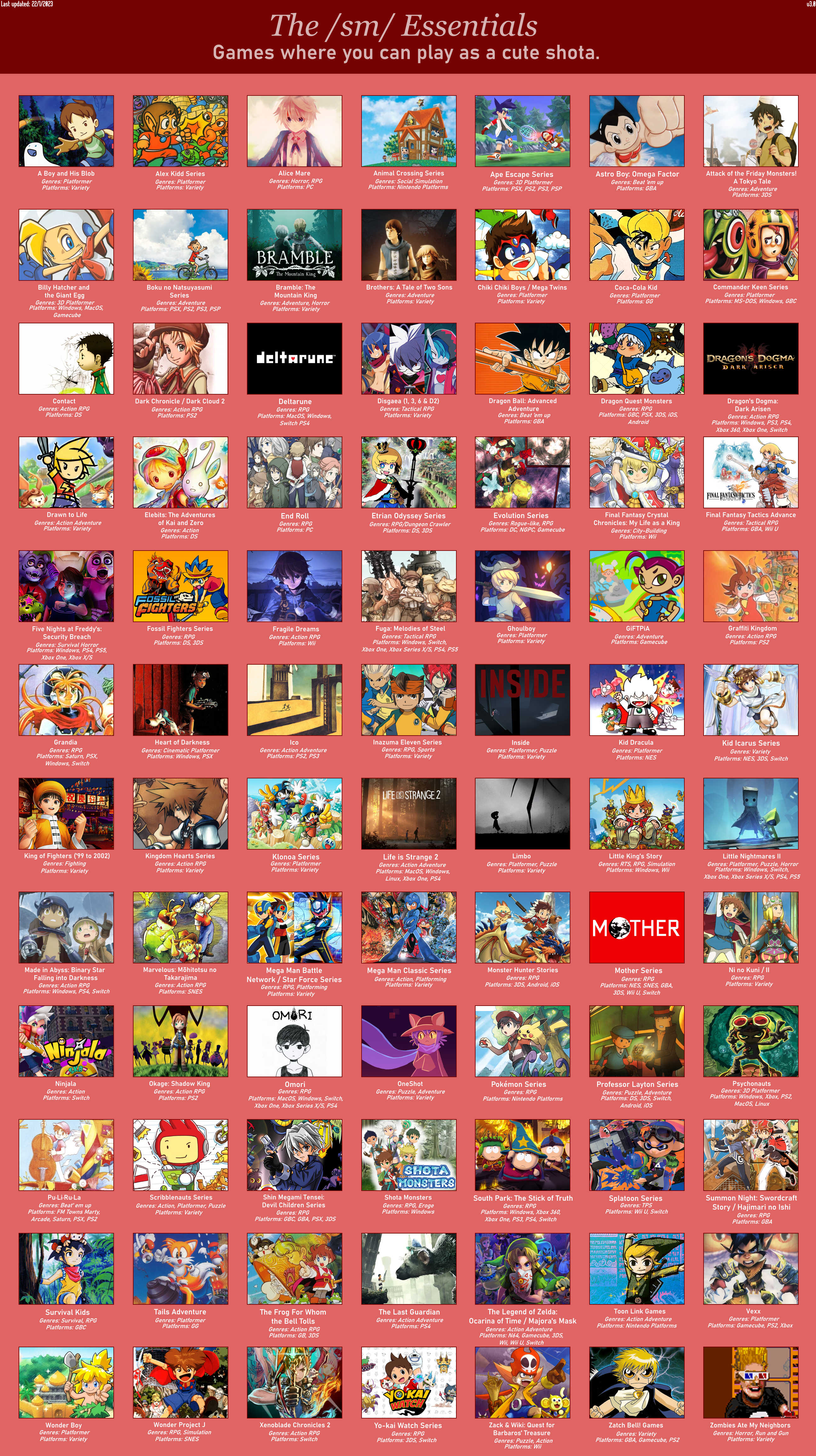 >>11480It’s definitely not up to date or accurate cause South Park and Fire Emblem should have purple outlines. And Hundred Line should be added. Also I’m confused on why Tales of Zestiria and Owari no Seraph didn’t get a blue outline.