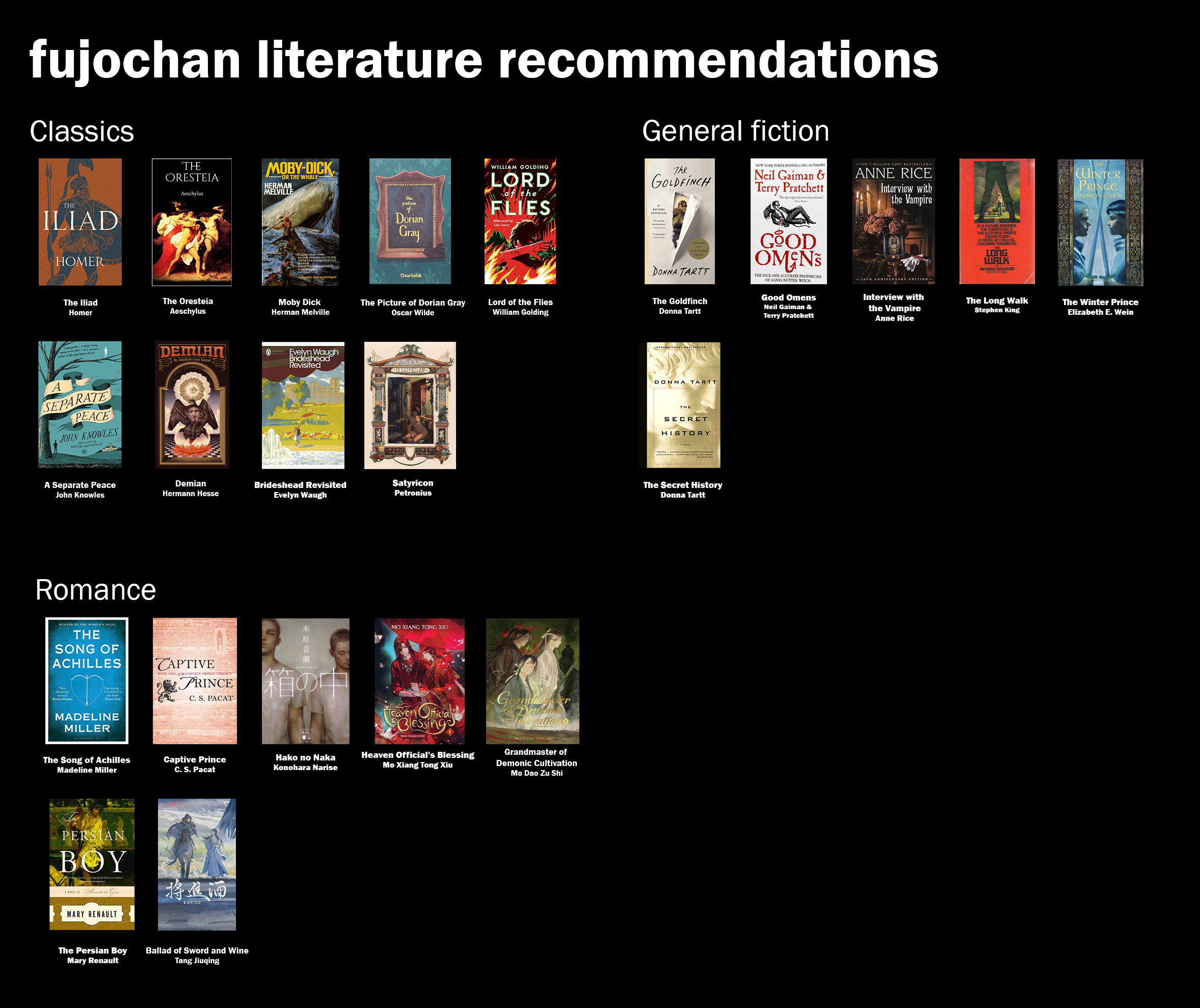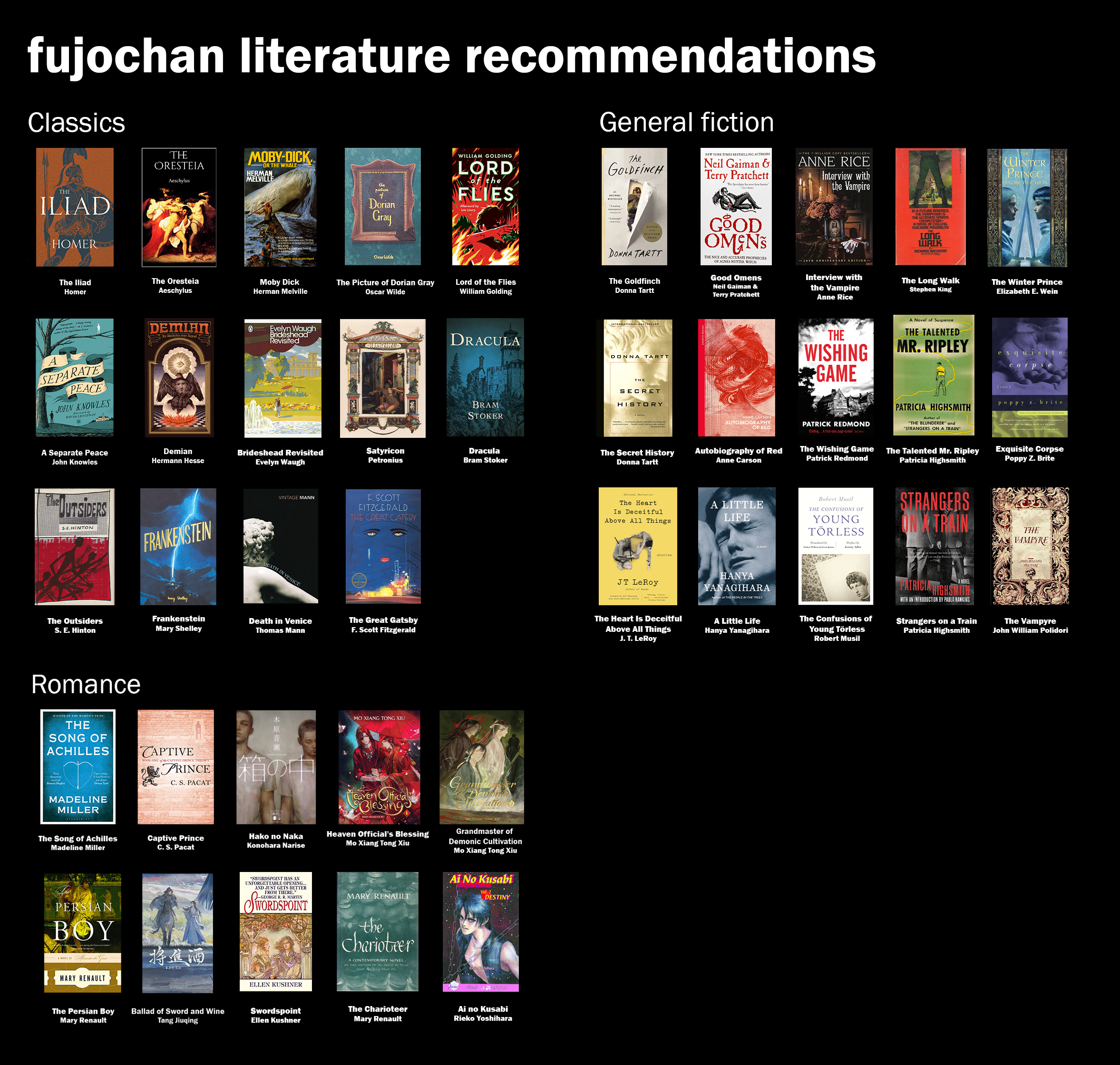 I wasn’t sure if to add The Great Gatsby and Les Miserables since I don't know how high the fujo bait is in them, I'm also on the fence about the Iliad.