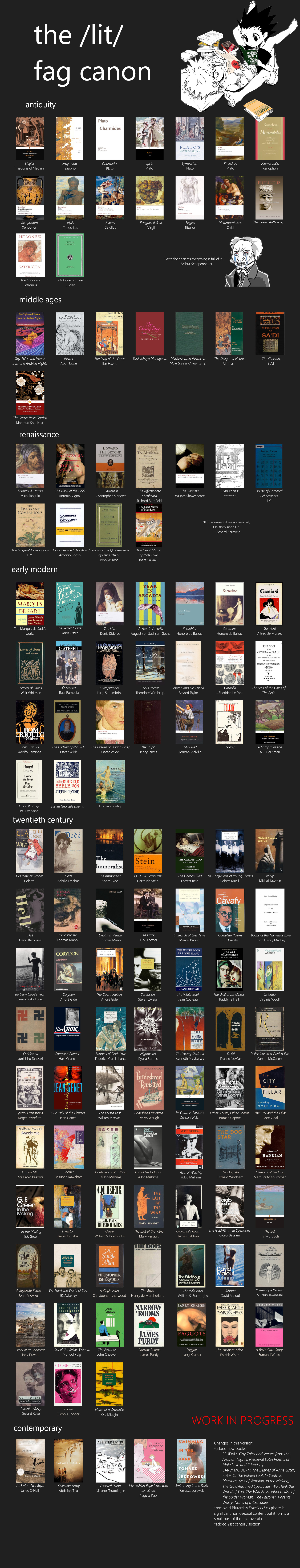 >>11508Love the final list! Thank you for your hard work. I'm happy there are other literature fujos on this site. I'm glad you added The Great Gatsby because when my nonfujo friend read it, she was like, "this is the gayest shit I've ever read," so I know I'm not being delusional kek.