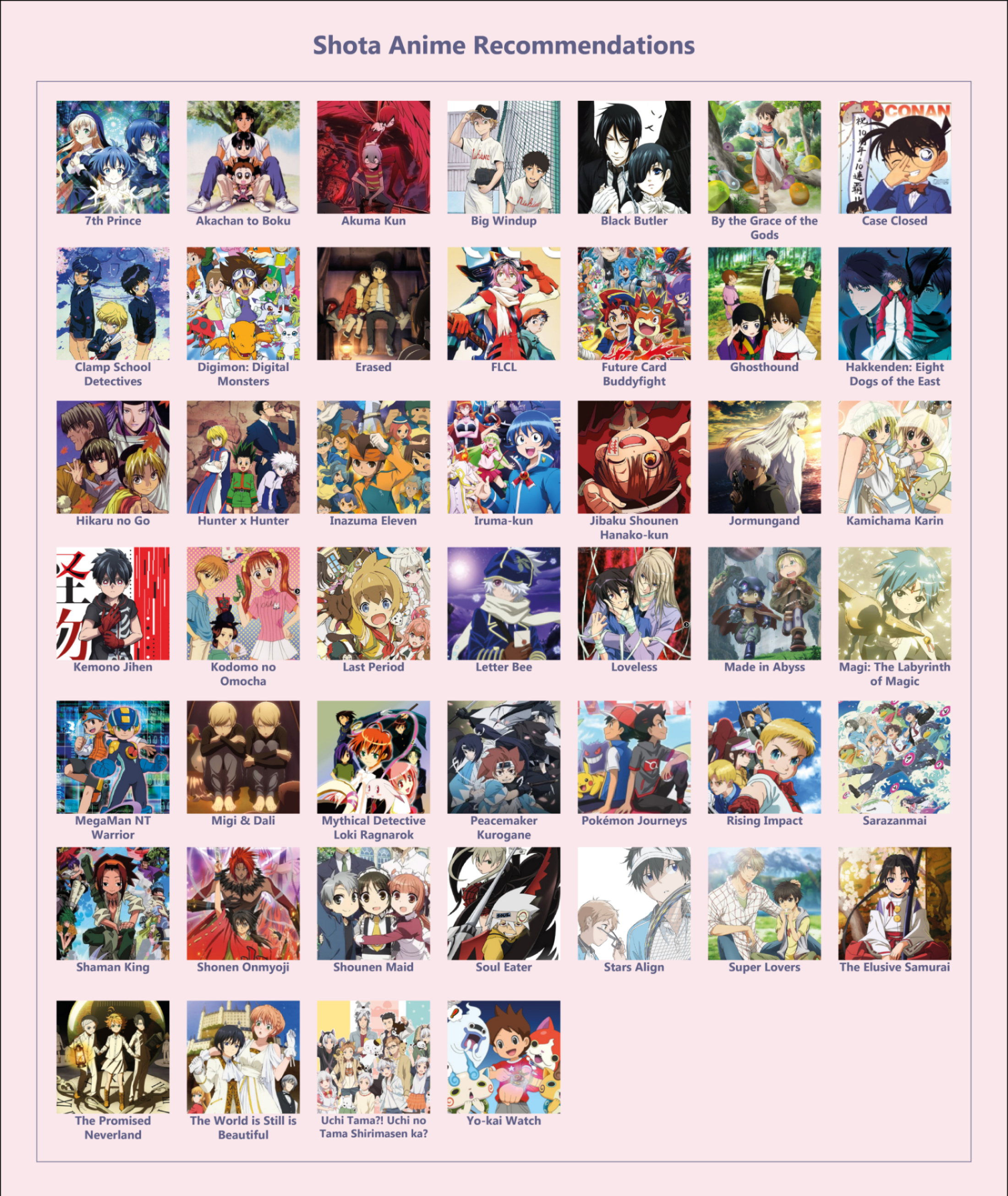 >>11539Thanks for offering to try nonna, they are: Shaman King, Mythical Detective Loki Ragnarok, Case Closed, Hakkenden: Eight Dogs of the East, Super Lovers, The Elusive Samurai, Shonen Maid, FLCL, Shonen Onmyoji, Kemono Jihen, Jormungand, Inazuma Eleven, Magi: The Labyrinth of Magic, Made in Abyss, The Promised Neverland, Loveless, Migi&Dali, 7th Prince, Soul Eater, Future Card Buddyfight, Big Windup!, By the Grace of the Gods, Yo-kai Watch, Hikaru no Go, Sarazanmai, Black Butler, Akuma Kun, Toilet-Bound Hanako-Kun, Last Period, Peacemaker Kurogane, Hunter x Hunter, Letter Bee, Digimon: Digital Monsters, Pokémon Journeys, MegaMan NT Warrior, Stars Align, Rising Impact, Iruma-kun, The World is Still is Beautiful