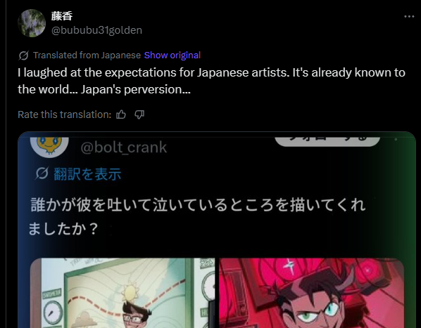 >>12991Which JJK ship is it? Is she fluent in Japanese or do you think she could be using a translating tool like google translate? If she's the type to often travel to Japan I get why she would do that, it's kind of like how western artists often tweet in English for their personal tweets but will be very likely to switch to their first language if they post about official releases or going to local cons in Europe and America outside of the USA, Canada and the UK. But on the other hand is Japanese that widespread in Korea nowadays?