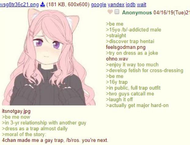 >>3546I've seen enough cringy male behavior like that on 4chan and I don't find it comparable to yaoi. Pic related I guess. I don't want to start a shitstorm with this (i know fujochan already had trapshitters and antitraps argue here) simply for voicing my opinion.