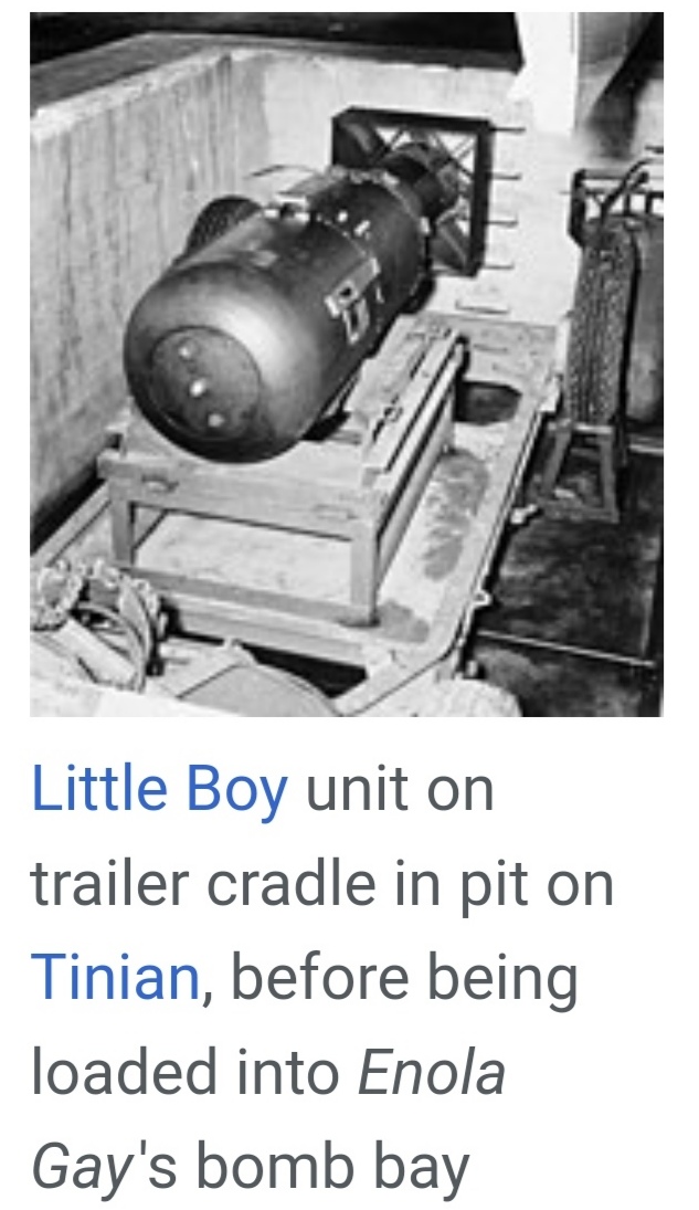 "Little Boy" was the name of the atomic bomb dropped on Hiroshima during WWII, and "Enola Gay" is the nickname of the plane that carried it and nuked with it. The plane's model is named Boeing B-29 Superfortress.