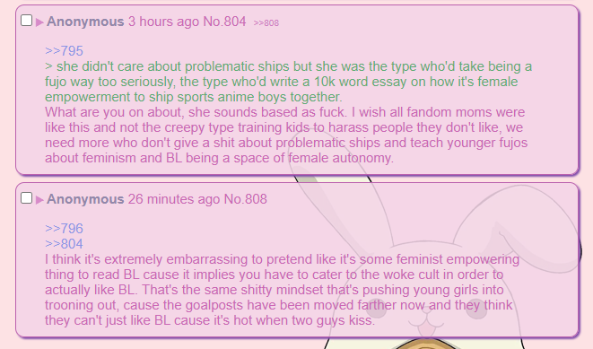 >>55The fujo thread on lolcow is the most based thread but unfortunately was regularly invaded by moids and tradthots. I always thought we deserved better but didn't move to fujochan until the /m/ board crashed and now it still isn't up, all those fujo generals and nice memes and copypastas are gone now… I'm so sad because there was one anon who would post new BL manga and summaries that she read every few months and I got so many new recommendations from her.