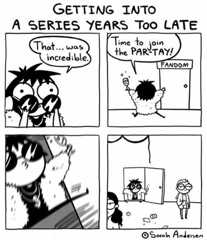 Honestly I like joining fandoms late because I enjoy the massive backlog of content, I hardly talk with real people and mainly just read and write by myself so the "party" being dead has no bearing on my enjoyment of trawling 15 year old FF stories.