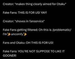 I tried to get back into it recently despite how dead it is, and a majority of the nu fans are either teens or preteens who hate the creator for making problematic content yet still consume her work while also bitching about "ze evil proshippers" despite DSP being a fujo herself and stating that she would continue drawing "problematic" stuff. Apparently she recently drew a tomboy character with big tits and that was enough to piss the whole fandom off, which is pretty insane considering she's drawn far worse in the past. The fandom's a shell of its former self compared to its glory days so I just stopped engaging with it altogether.