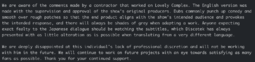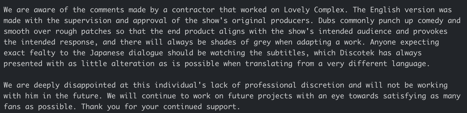 >>4811Wow, I actually love Discotek since they are the only company that actually releases the older anime I enjoy. I'm glad they are distancing themselves at least and am sad that this happened under their label. I trust the subs will be fine and it's an unfortunate situation. I've only read the Lovecom manga and have no great love for it, but this sucks for fans and I'm sorry your legal release is saddled with this.