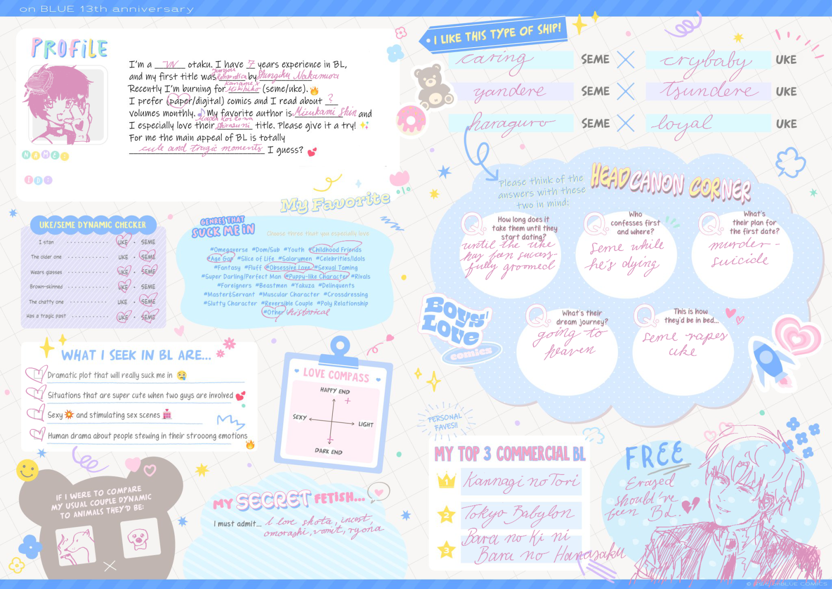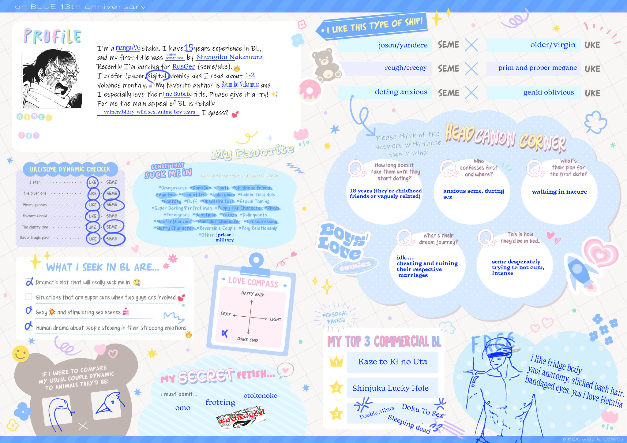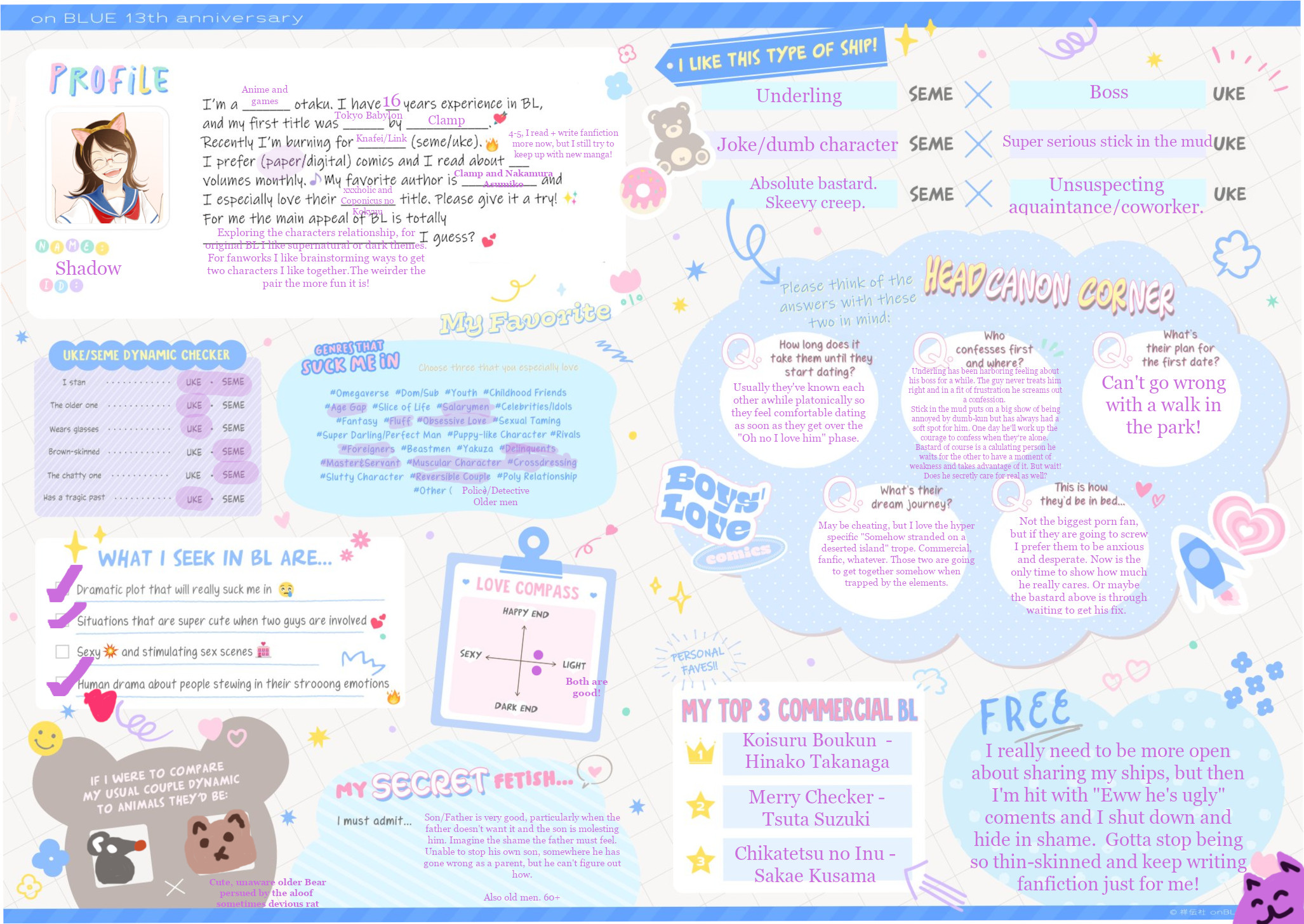 >>7323>I have a tiny amount of fujo merch but not enough to really qualify as a collection>I like any kind of uke, not just masculine ones>My online fujo friend became IRL fujo friend>I like semes and ukes equally>I guess I am a proshipper because I am against antis but I wouldn't put it in a bio or anything, I just ship the shit I ship and happen to have a lot of ships hated by antis>I do not watch much BL anime, but I have seen all the MXTX adaptations and a few others>Only live action gay stuff I have seen is cdramasI think my fujo awakening was when I was around 9…