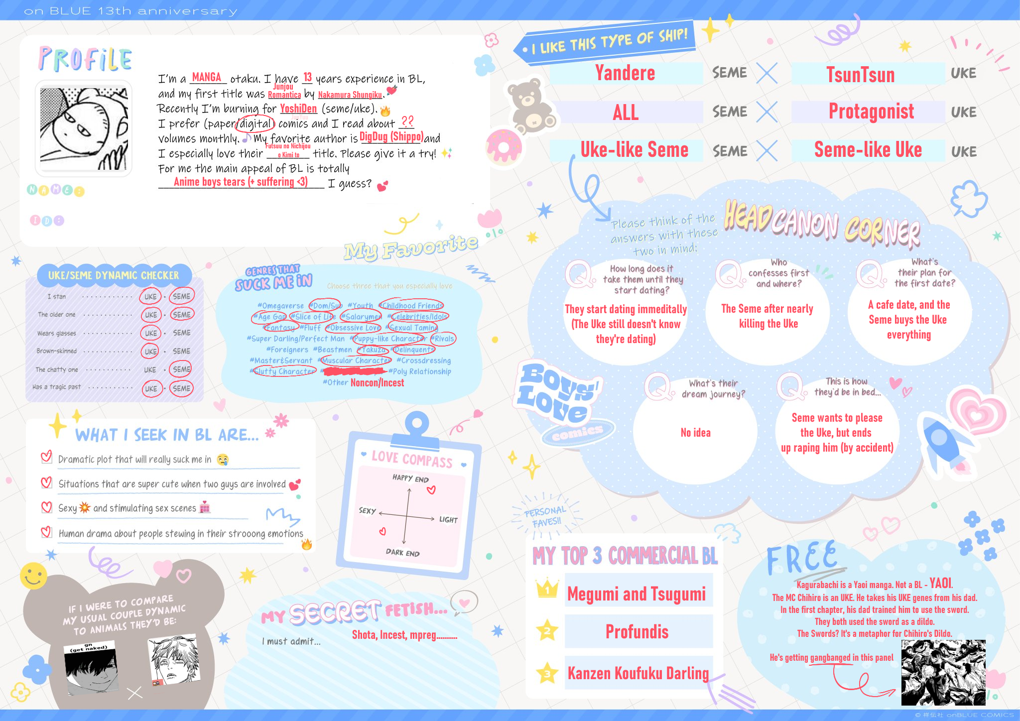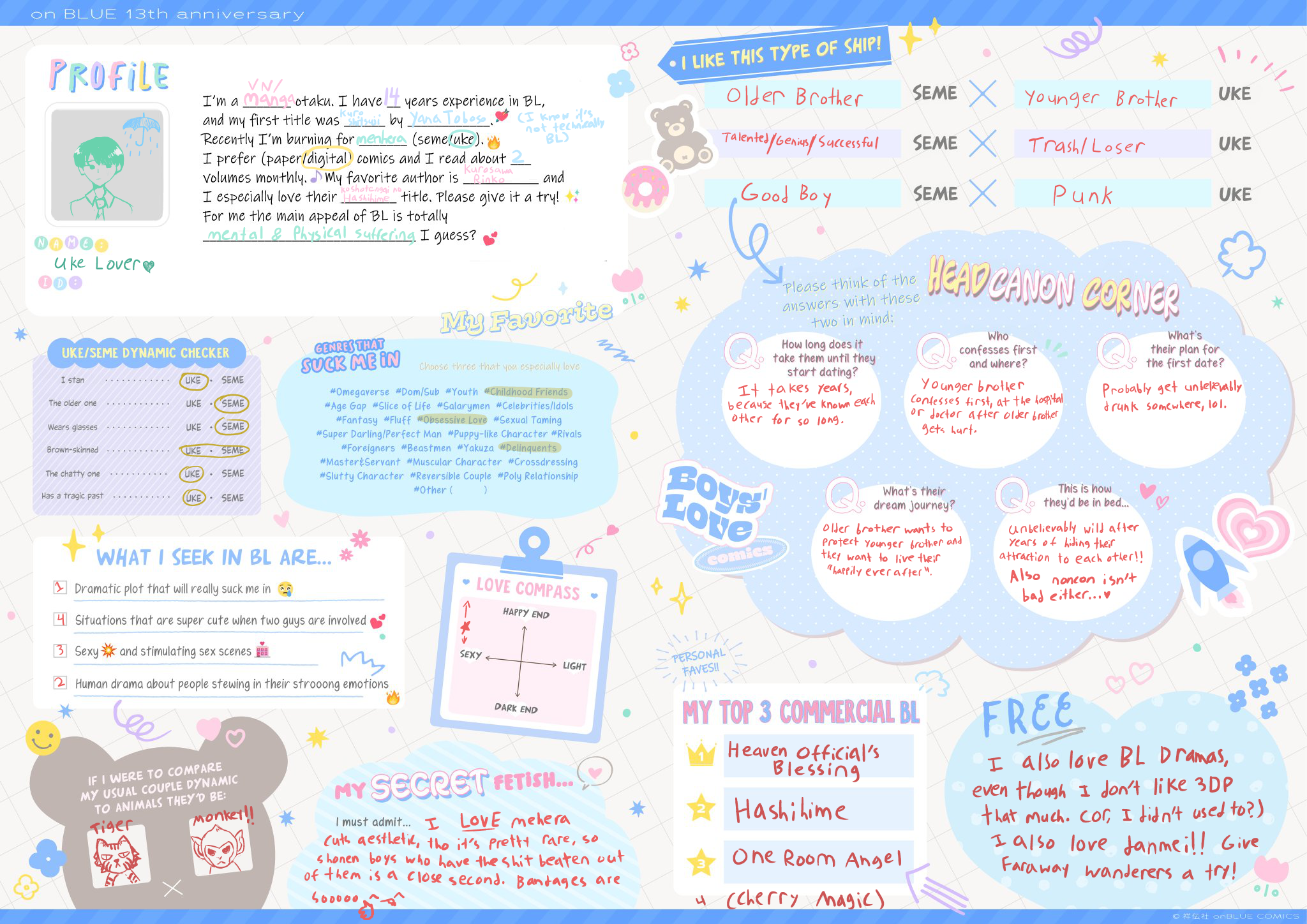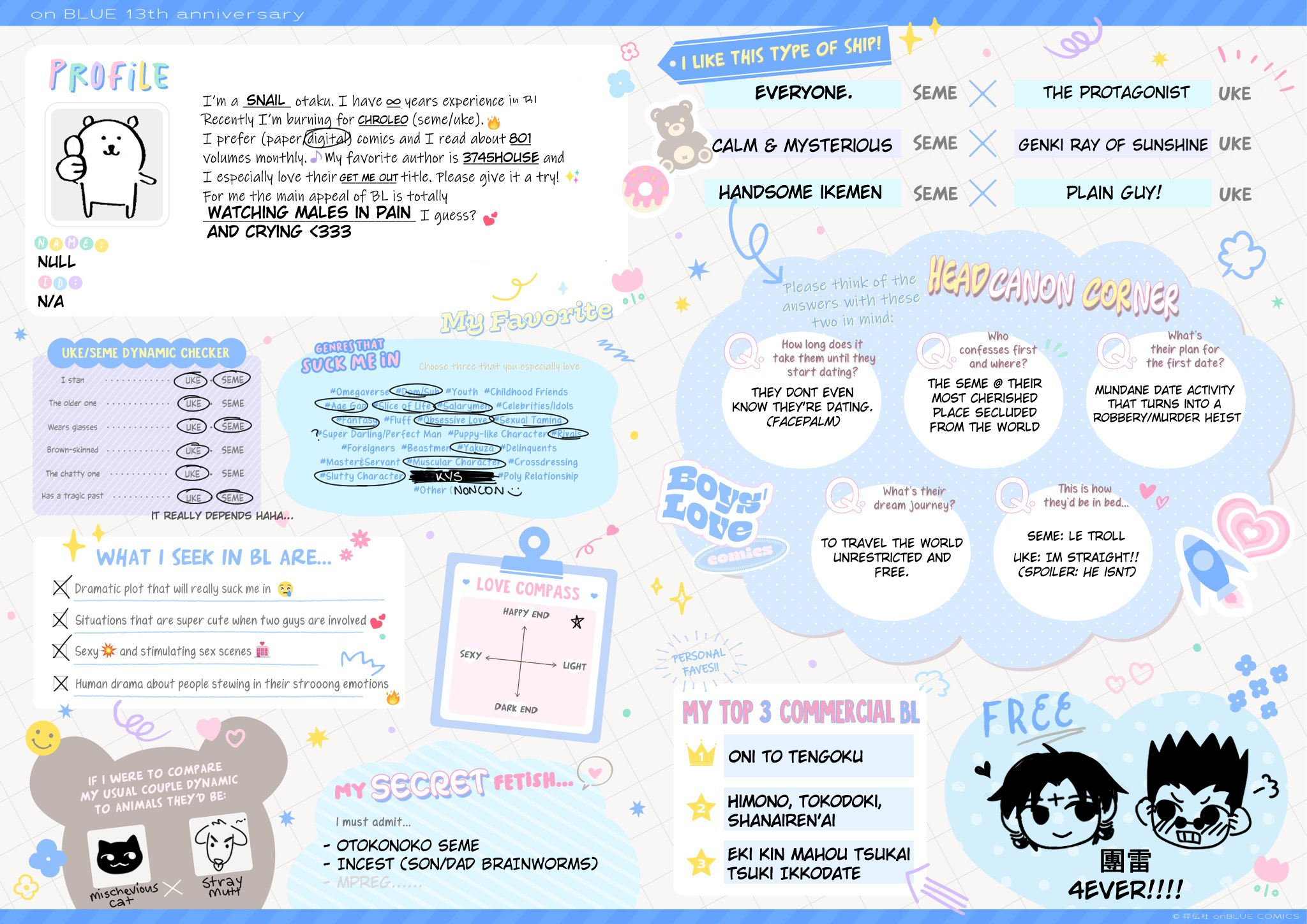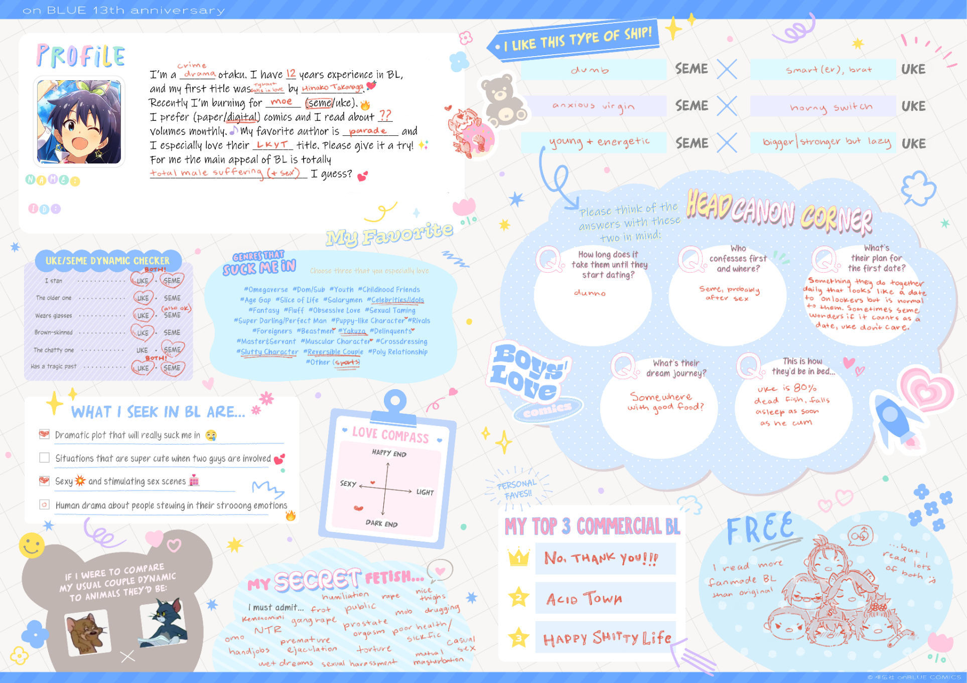 >>7323>I have a tiny amount of fujo merch but not enough to really qualify as a collection>I like any kind of uke, not just masculine ones>My online fujo friend became IRL fujo friend>I like semes and ukes equally>I guess I am a proshipper because I am against antis but I wouldn't put it in a bio or anything, I just ship the shit I ship and happen to have a lot of ships hated by antis>I do not watch much BL anime, but I have seen all the MXTX adaptations and a few others>Only live action gay stuff I have seen is cdramasI think my fujo awakening was when I was around 9…