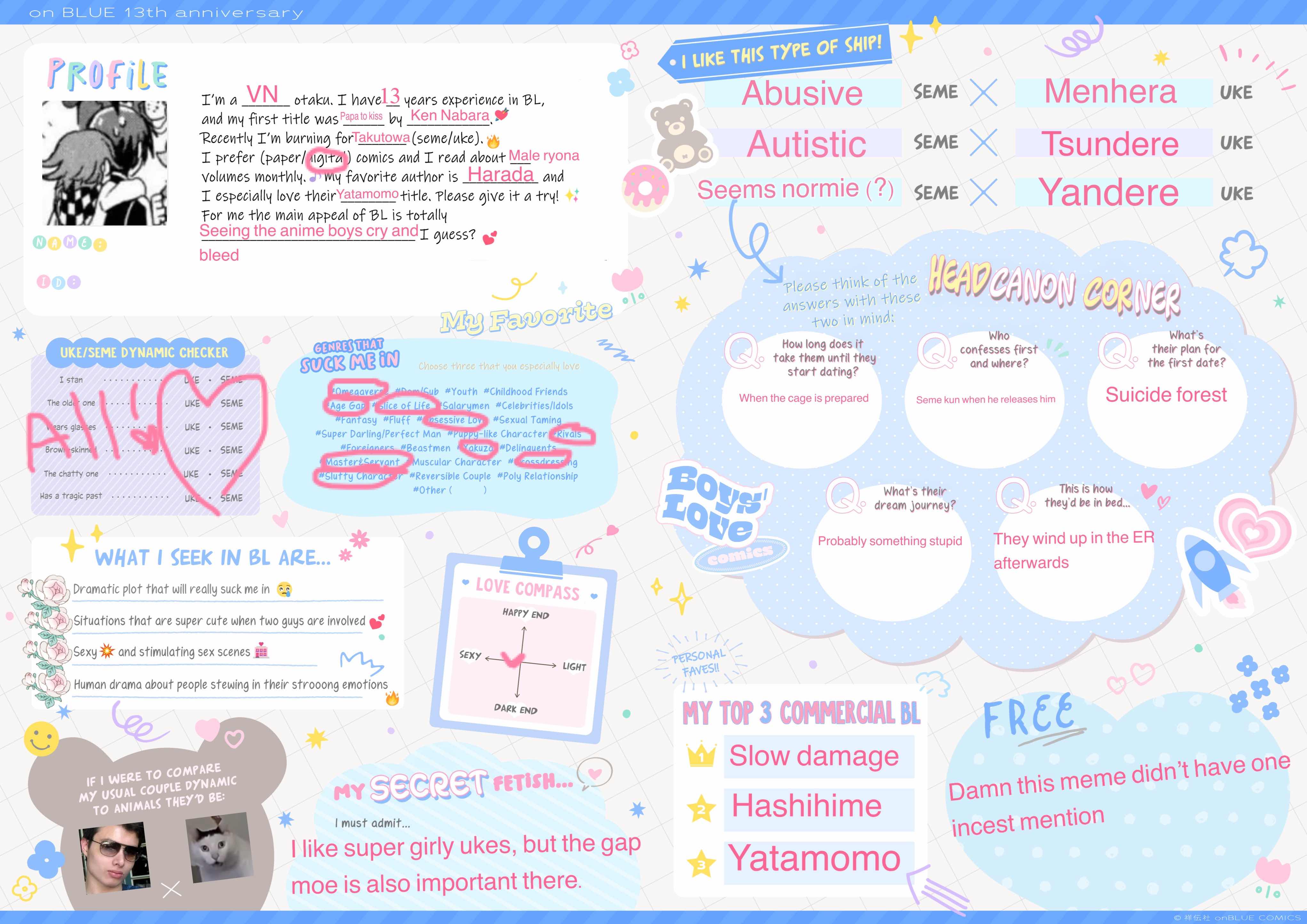 >won't engage in pro/anti bullshittery but gun to head def pro>love games like tokimeki girl's side, but wouldn't consider myself a otomefag>can enjoy homo 3DPD like IWTV and reality shows like The Boyfriend, but not pornI've also been meaning to get into danmei which would have gotten me a bingo, just don't know where to start.
