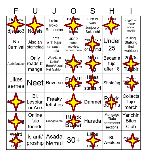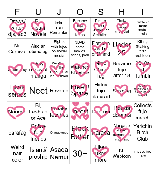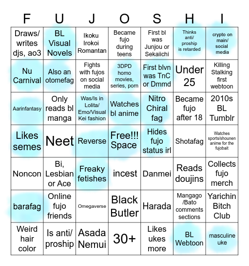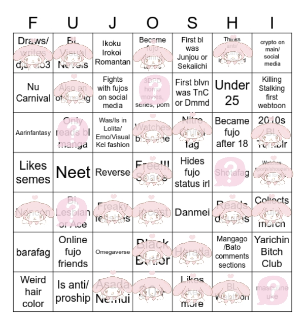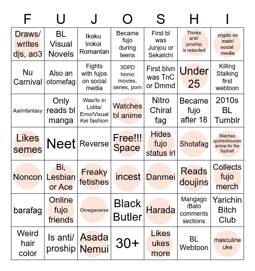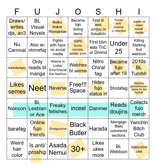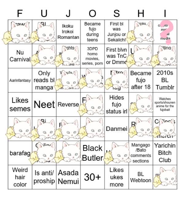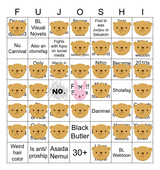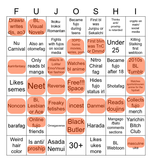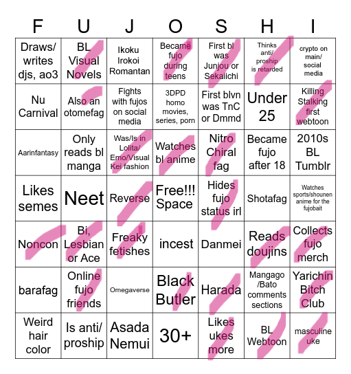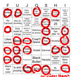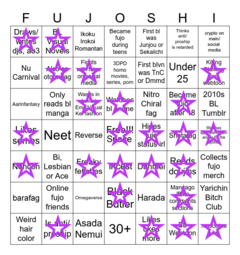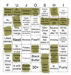 >>7323I'd have a bingo if I was a coward and hid my fujo status.