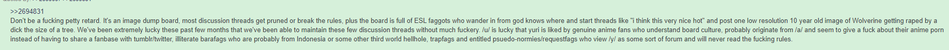 >>7965 might be correct I forgot about this. I saved this post as well because it's pretty on point. The lack of discussion on /cm/ as well as the lack of proper sentences on /a/ might very well be an issue coming from people that don't bother to learn English and only come to post a short phrase they memorized or textless pics.